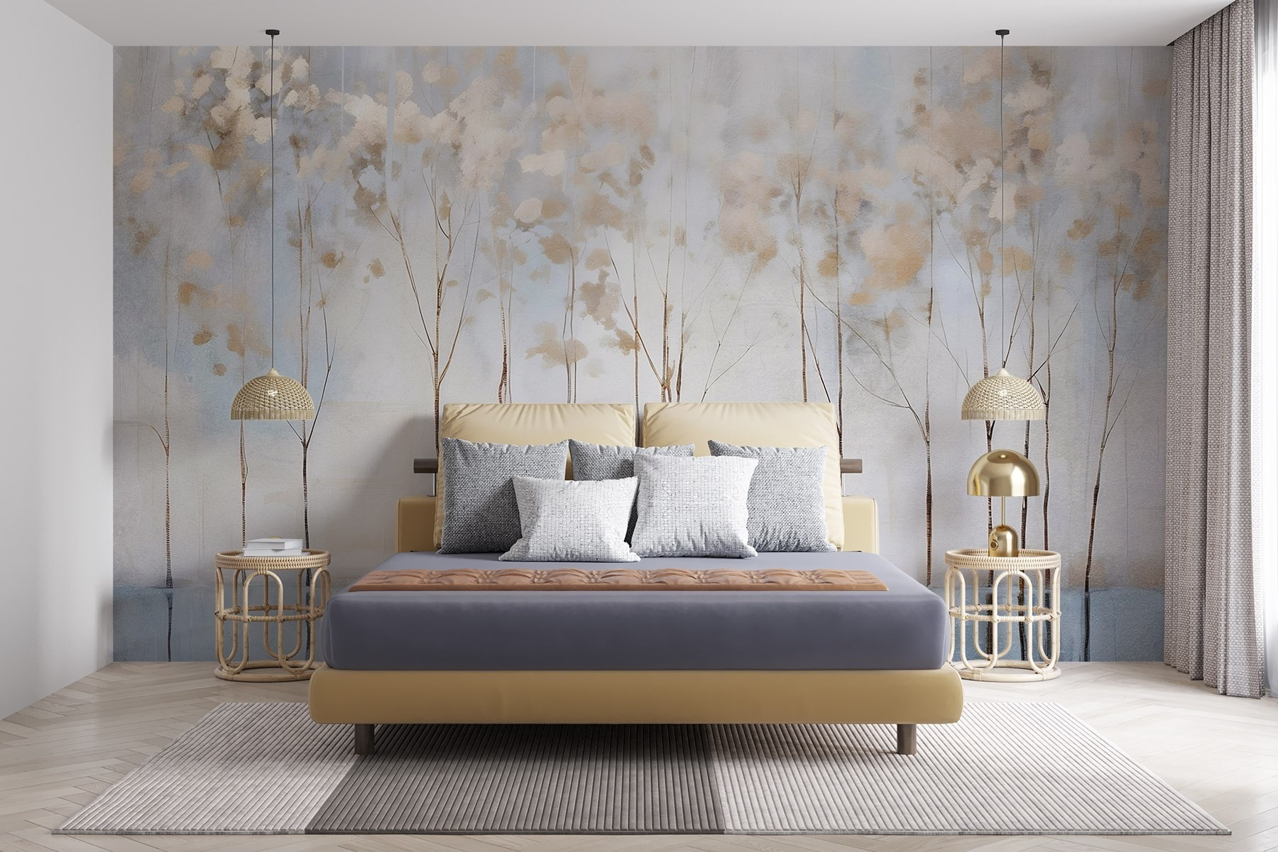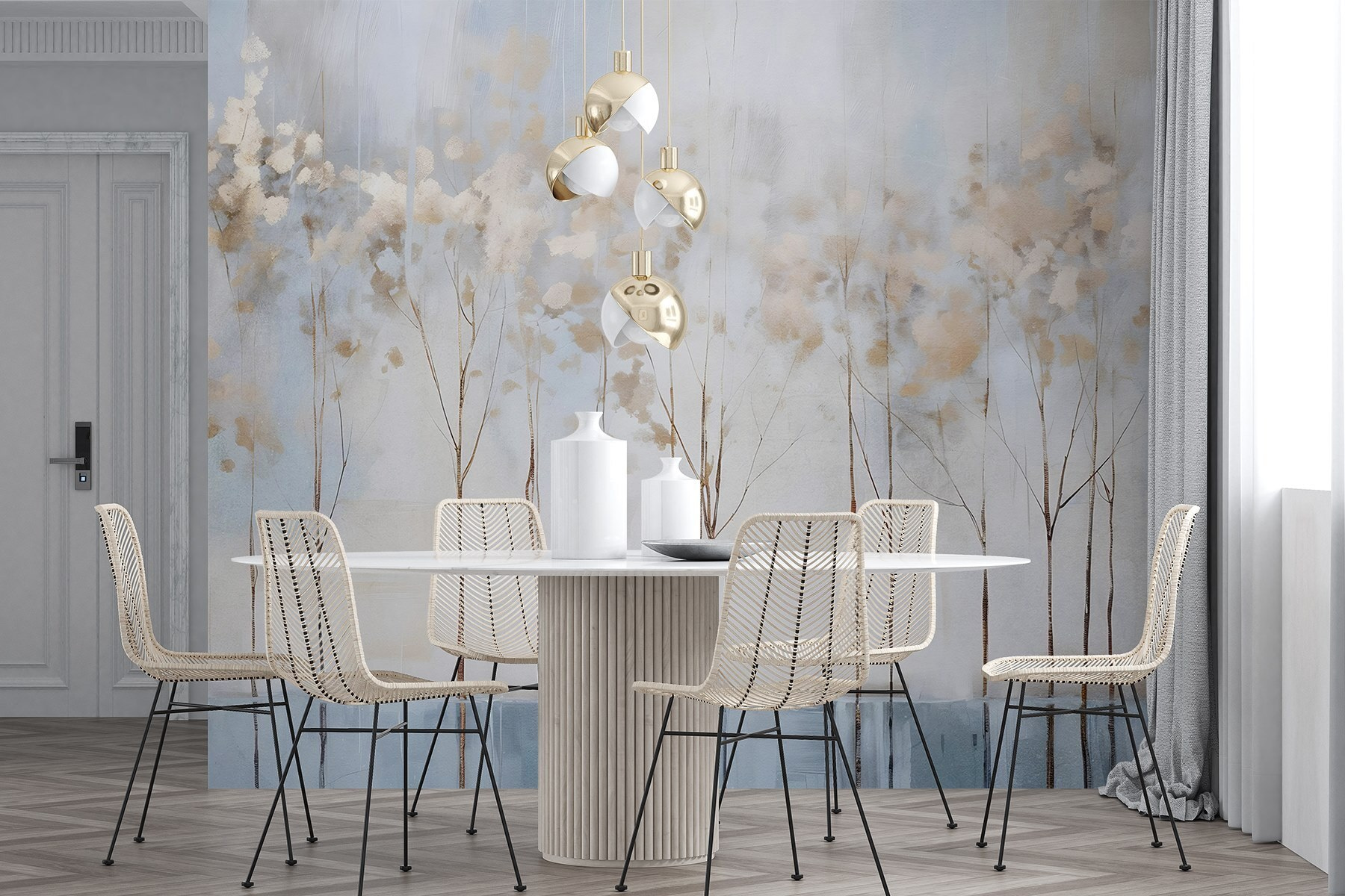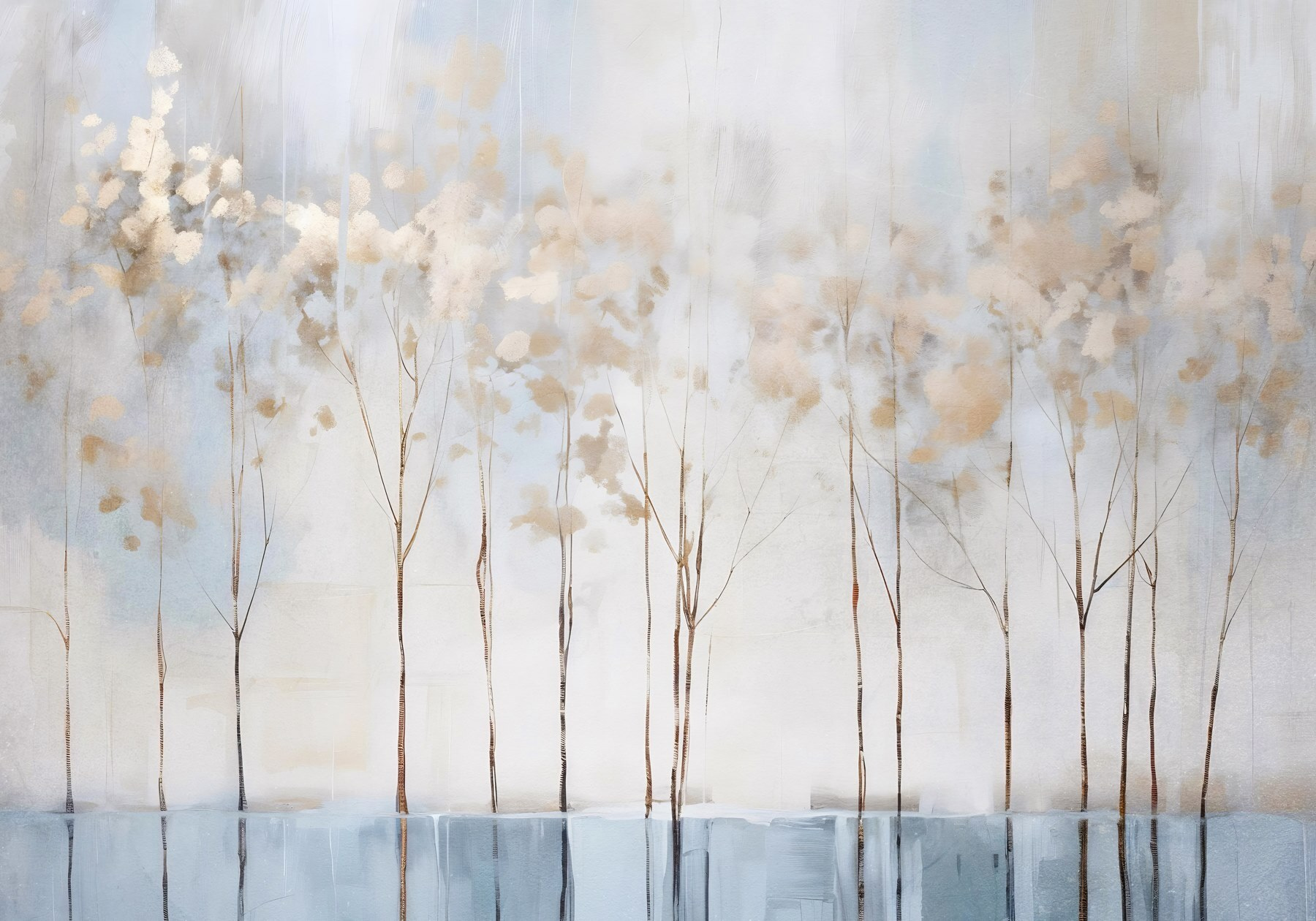 Stellen Sie sich vor, Sie betreten einen Raum, in dem eine ruhige Baumreihe Sie mit dem sanften Flüstern der Natur empfängt. Dieses Wandgemälde “Bäume in einer Reihe” verwandelt jede Wand in einen einladenden Rückzugsort. Die sanften Farben und Aquarellstriche schaffen eine beruhigende Atmosphäre – perfekt für eine gemütliche Ecke oder ein lebhaftes Heimbüro. Stellen Sie sich vor, Sie schlürfen einen Tee, betrachten diese zarten Bäume und spüren, wie der ganze Stress von Ihnen abfällt. Es ist, als ob man sich ein Stück Natur ins Haus holt, nur ohne die Mücken. Mit dieser Fototapete wird jeder Blick zu einem kleinen Rückzugsort. Es ist ein kleines Stück Ruhe, das nur darauf wartet, genossen zu werden.