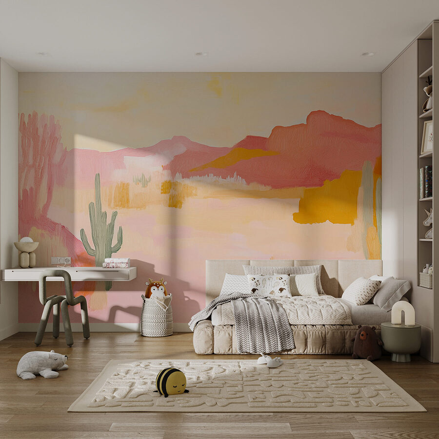 Stellen Sie sich vor, Sie verwandeln Ihr Zimmer mit dieser atemberaubenden Fototapete in eine heitere Wüstenoase. Das Bild zeigt eine verträumte Landschaft in warmen Rosa- und zarten Gelbtönen und verbreitet eine beruhigende Atmosphäre, die das Gefühl vermittelt, in der Abenddämmerung durch eine sonnenbeschienene Wüste zu wandern. Stellen Sie sich eine gemütliche Ecke vor, in der Sie Ihren Kaffee schlürfen und von spontanen Roadtrips träumen. Die verspielten Kakteen und die sanften Hügel bringen Leben und Wärme und verwandeln Ihre Wände in eine Leinwand mit der Schönheit der Natur. Es ist, als hätten Sie ein Fenster zur Wildnis direkt in Ihrem Zuhause – ohne Sand in den Schuhen! Perfekt für jeden, der sich einen Hauch von Ruhe in seinem Raum wünscht.