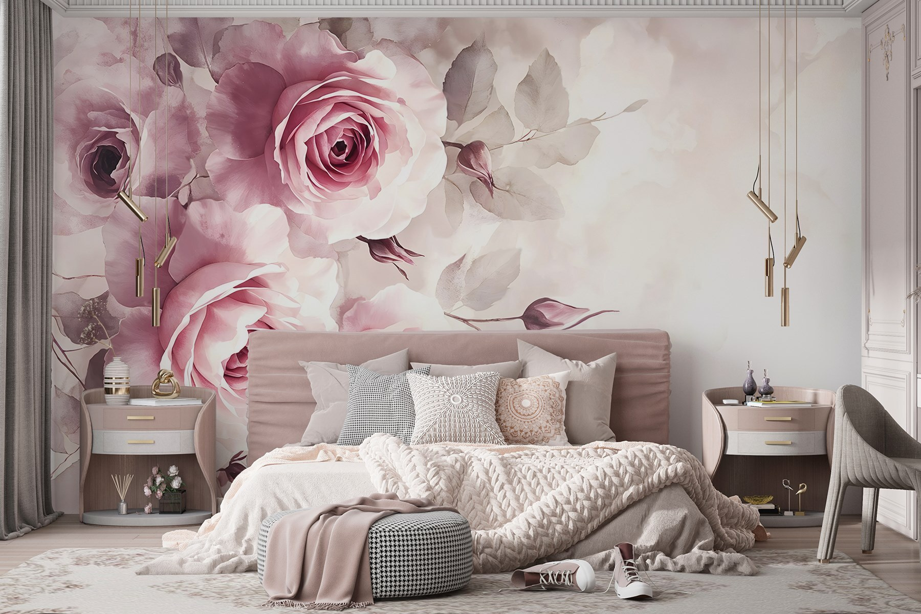Verwandeln Sie jeden Raum in einen heiteren Garten mit dieser bezaubernden Fototapete, die eine Gruppe rosa Rosen zeigt. Stellen Sie sich vor, Sie wachen jeden Morgen mit diesen zarten, romantischen Blüten auf, als hätte die Natur beschlossen, Ihren Raum persönlich zu schmücken. Die sanften Farbtöne sorgen für eine warme Atmosphäre, perfekt für gemütliche Abende bei einem Tee oder einem Glas Wein. Außerdem setzen sie genau den richtigen Farbtupfer, ohne dabei aufdringlich zu wirken.