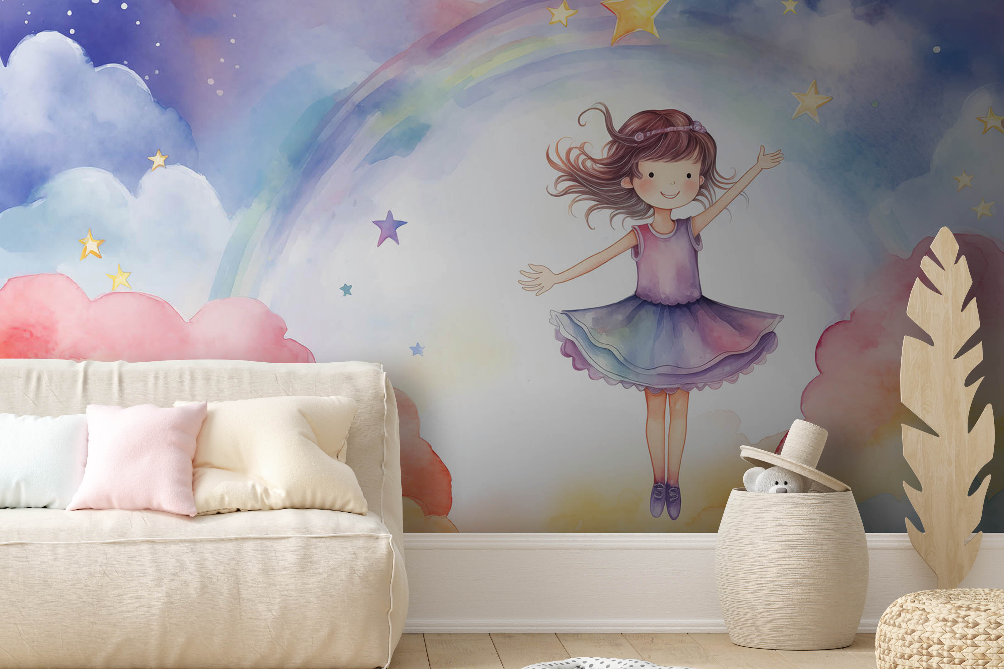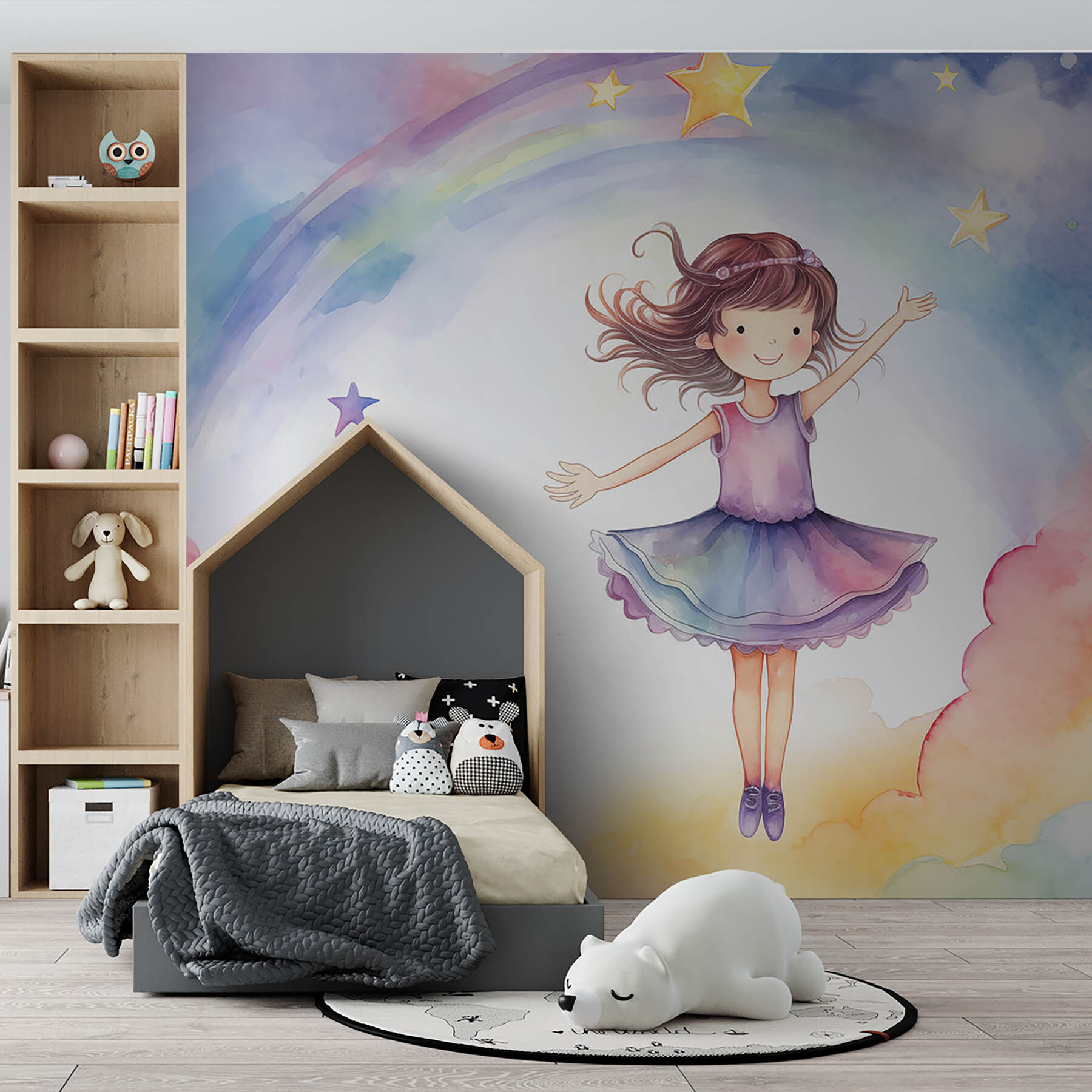 Verwandeln Sie den Raum Ihres Kindes mit dieser bezaubernden Fototapete, die ein bezauberndes Mädchen in einem skurrilen Kleid zeigt, das zwischen Wolken und Sternen tanzt. Die sanften Pastellfarben schaffen eine verträumte Atmosphäre, die die Fantasie und das Staunen anregt – perfekt für eine gemütliche Leseecke oder ein verspieltes Schlafzimmer! Es ist, als würde man ein Miniaturmärchen in den Raum einladen. Stellen Sie sich das Kichern und die Geschichten vor, die sich vor diesem Wandbild entfalten, bei dem jeder Blick die Kleinen in eine Welt voller Abenteuer entführen könnte. Es ist nicht nur eine Dekoration, sondern eine Einladung zu großen Träumen und dem Zauber der Kindheit!