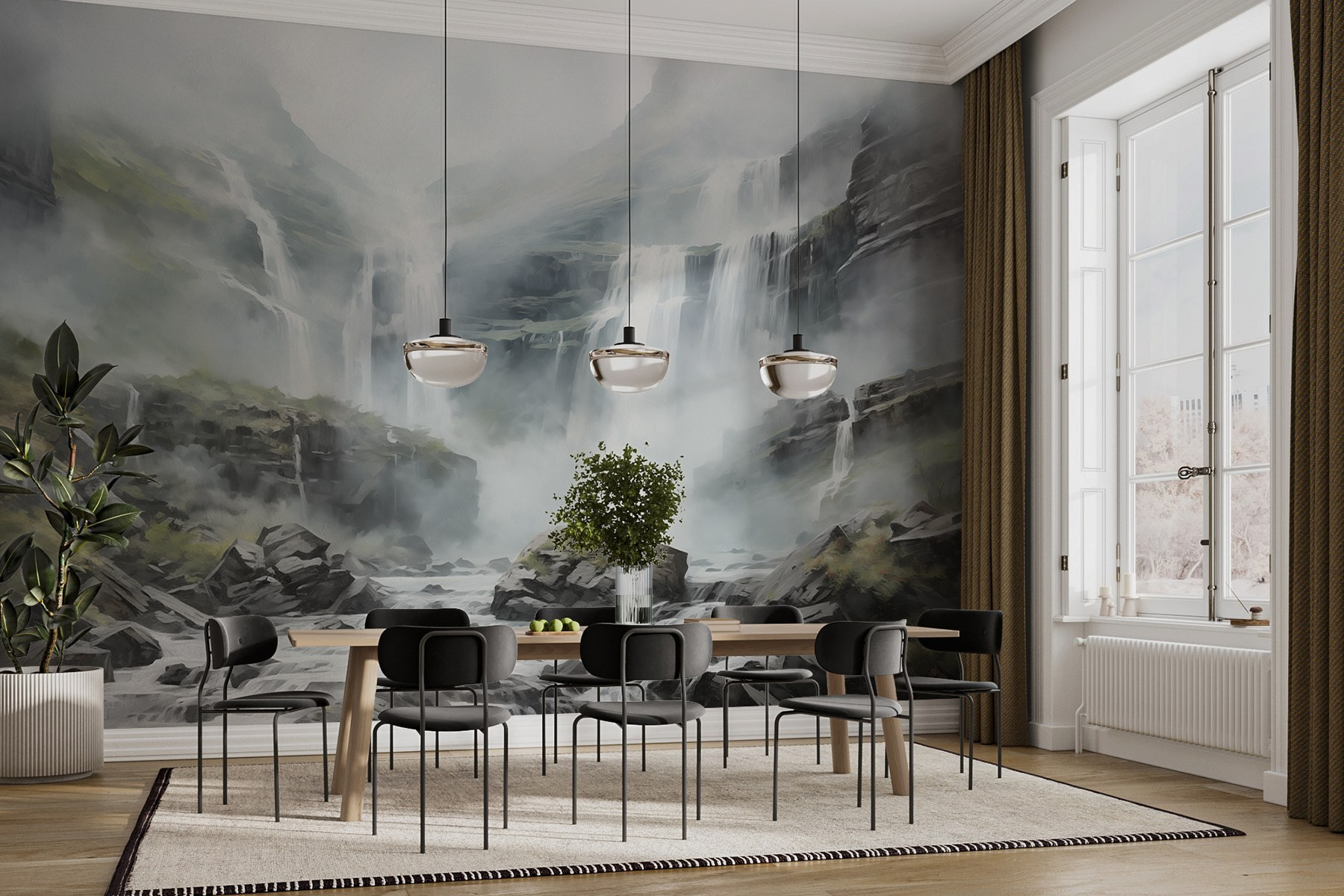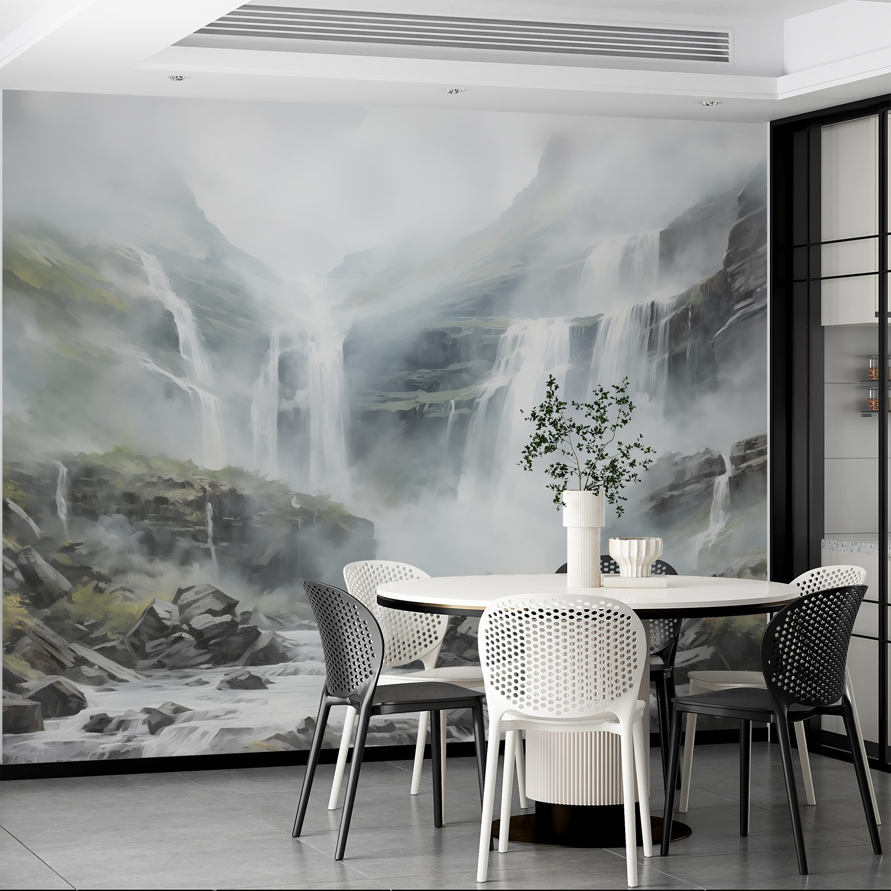 Stellen Sie sich vor, dass Sie jedes Mal, wenn Sie einen Blick auf Ihre Wand werfen, in eine heitere Welt eintauchen. Diese Fototapete “Wasserfall in nebligen Bergen” fängt diesen Zauber perfekt ein. Stellen Sie sich kaskadenförmige Wasserfälle vor, die in sanften Nebel gehüllt sind, umgeben von üppigem Grün und felsigem Terrain. Es ist wie die beruhigende Melodie der Natur direkt in Ihrem Wohnzimmer. Das sanfte Fließen des Wassers flüstert beinahe Ruhe aus und lädt zum Innehalten und Durchatmen ein. Freunde könnten sogar mit ihren Mini-Ferien-Vibes bei Ihnen prahlen, und wer würde sich das nicht wünschen? So holt man sich auf raffinierte Weise ein Stück Wildnis ins Haus. Dieses Wandbild ist perfekt für alle, die von einem friedlichen Urlaub träumen und lädt Sie in eine Welt ein, in der der Stress einfach… verblasst.