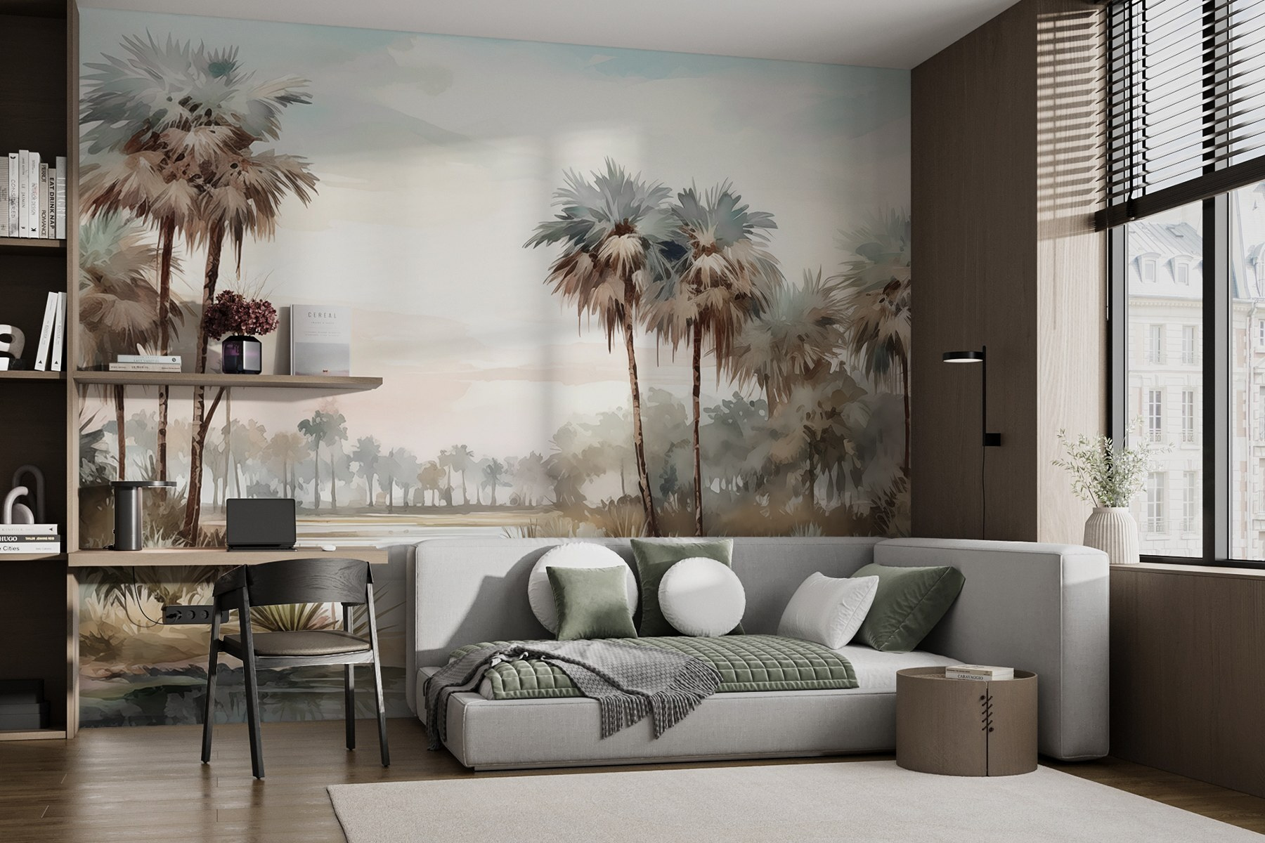 Verwandeln Sie Ihren Raum mit dieser bezaubernden Fototapete “Wasser und Palmen an einem Fluss”. Stellen Sie sich vor, Sie betreten einen Raum, in dem sich üppige Palmen sanft über einem ruhigen Fluss wiegen und ein Stück Paradies direkt in Ihr Zuhause bringen. Die sanften Farben und die zarten Striche schaffen eine friedliche Atmosphäre – perfekt zum Träumen oder einfach nur zum Kaffeetrinken, während Sie so tun, als wären Sie an einem Strandurlaub.