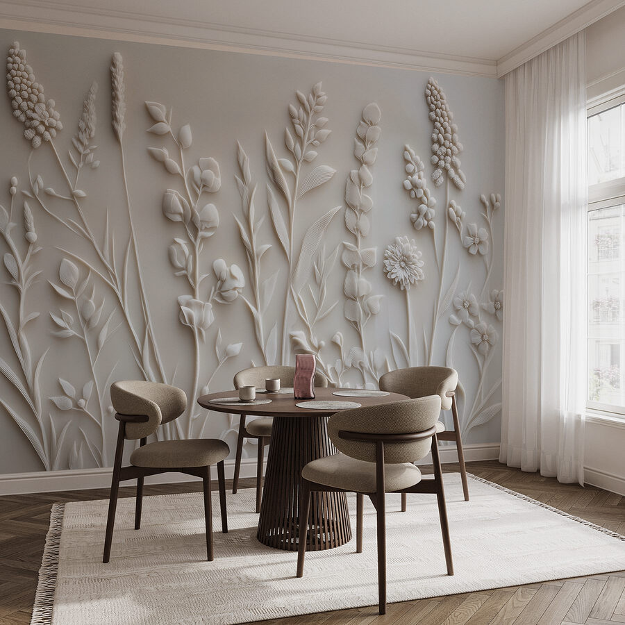 Verwandeln Sie Ihren Raum mit dieser atemberaubenden Fototapete, die ein zartes weißes Blumen- und Blattmotiv zeigt. Stellen Sie sich vor, Sie betreten einen Raum voller sanfter Naturtöne, in dem jeder Blick wie ein frischer Windhauch wirkt. Diese Fototapete steht nicht einfach nur da, sondern lädt Sie ein, in den Raum einzutreten und Geschichten über ruhige Gärten und faule Nachmittage zu erzählen. Perfekt, um eine ruhige Oase in Ihrem Zuhause zu schaffen, denn es ist, als hätten Sie einen geheimen Garten direkt an der Wand. Ganz gleich, ob Sie Kaffee kochen oder sich mit einem Buch entspannen, dieses Design verleiht Ihnen eine schicke, von der Natur inspirierte Atmosphäre, die jeden Moment ein wenig versüßt. Es ist einfach und doch auffallend – eine wunderschöne Kulisse, die mit ihrer mühelosen Eleganz Freude bereiten kann. Wer würde sich nicht gerne damit umgeben?