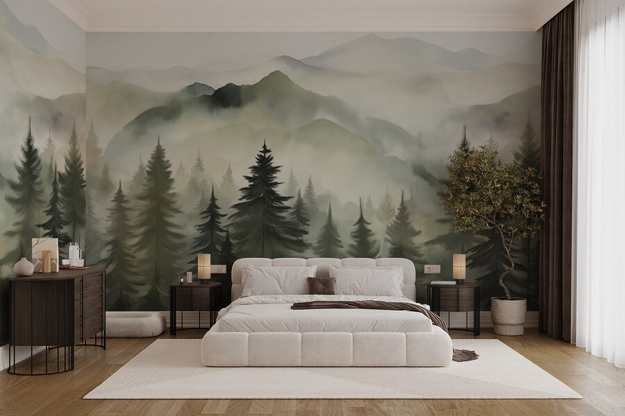 Fototapeten Nebliges Gebirge mit Bäumen (Artikelnummer: w08639)