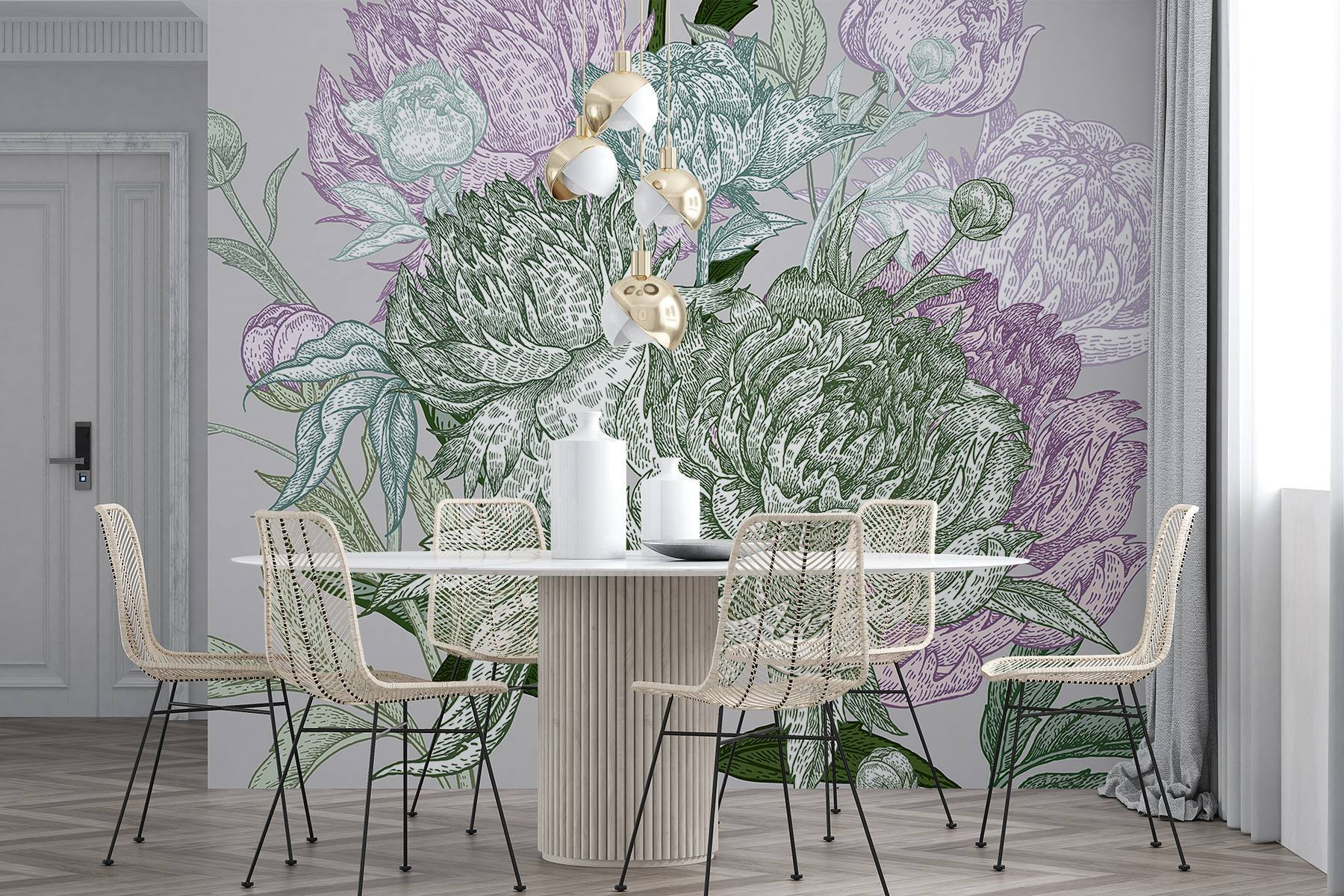 Verwandeln Sie Ihren Raum mit “Lush Blooms in Delicate Hues” – ein Wandbild, das sich wie eine sanfte Brise anfühlt, die den Duft des Frühlings trägt. Stellen Sie sich vor, Sie wachen mit dem sanften Erröten der Pfingstrosen und dem beruhigenden Grün auf, das Ihren Wänden einen malerischen Touch verleiht. Es ist, als hätte man einen Garten im Haus, nur ohne die Gießkanne! Dieses Design bringt sonnige Wohlfühlatmosphäre in jeden Raum und regt zu Tagträumen und gemütlichen Kaffeegesprächen an. Perfekt für eine Leseecke oder eine leere Wand, die nach etwas Leben schreit. Wenn Freunde zu Besuch kommen, werden sie sich in den komplizierten Details verlieren und wahrscheinlich fragen, wo die Blumen sind – wie magisch ist das denn?