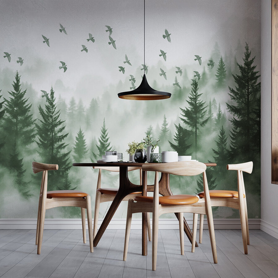 Verwandeln Sie jeden Raum mit der bezaubernden Fototapete “Birds Flying Over a Forest”. Stellen Sie sich vor, Sie wachen jeden Tag in einem heiteren, nebligen Wald auf, in dem jedes Detail Frieden ausstrahlt. Die anmutigen Vögel, die über Ihnen schweben, verleihen Ihren Wänden einen Hauch von Magie und Freiheit. Es eignet sich perfekt für gemütliche Zimmer oder lebhafte Lounges – überall dort, wo man einen Hauch von Naturzauber gebrauchen kann. Und wer möchte sich nicht jedes Mal, wenn er eintritt, wie in einem verträumten Waldstück fühlen? Dieses einfach anzubringende Wandbild mit seinen zarten Grüntönen und seiner beruhigenden Ausstrahlung lässt Sie die Außenwelt vergessen und weckt Neid. Ideal für Tagträumer und Naturliebhaber gleichermaßen!