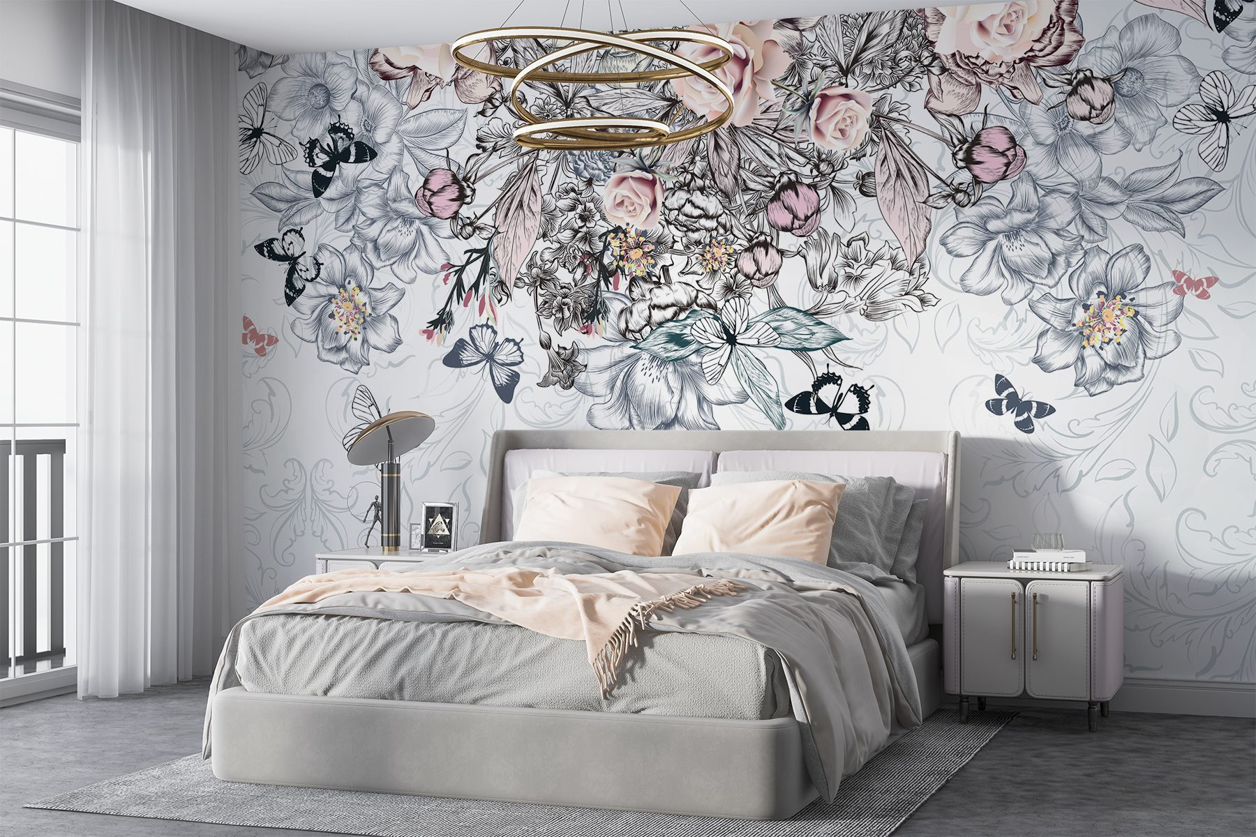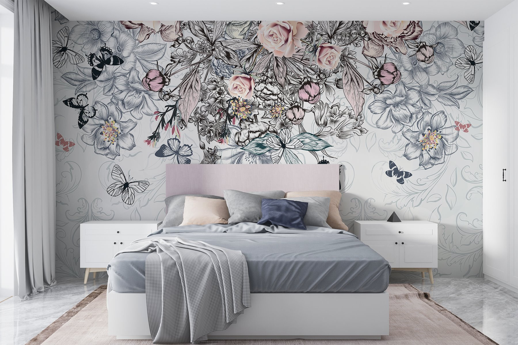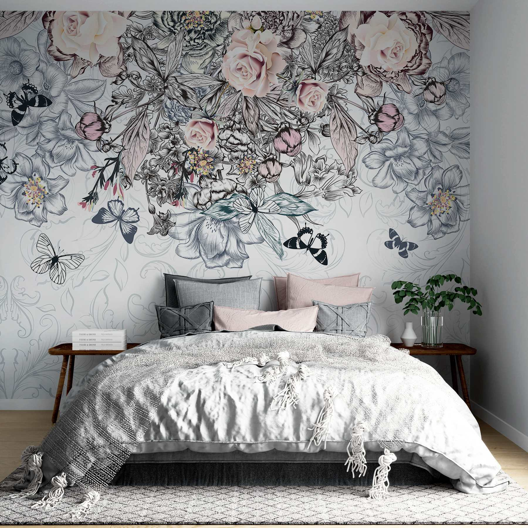 Verwandeln Sie Ihren Raum in eine lebendige Oase mit dieser fesselnden Fototapete, die eine atemberaubende Mischung aus Blumen und Schmetterlingen zeigt. Es ist wie ein skurriler Garten, in dem Blüten und zarte Flügel miteinander tanzen und eine einladende Atmosphäre schaffen. Stellen Sie sich vor: Sie betreten einen Raum und fühlen sich sofort beschwingt, als ob der Frühling schon früh für Sie da wäre. Die sanften Farben und charmanten Details wecken Freude und inspirieren zu Tagträumen. Dieses Wandbild eignet sich perfekt für eine gemütliche Leseecke oder eine fröhliche Küche. Es bringt die Natur ins Haus und flüstert süße Töne der Entspannung und Schönheit. Wer wünscht sich nicht ein wenig unbeschwerte Magie in seinem Zuhause?