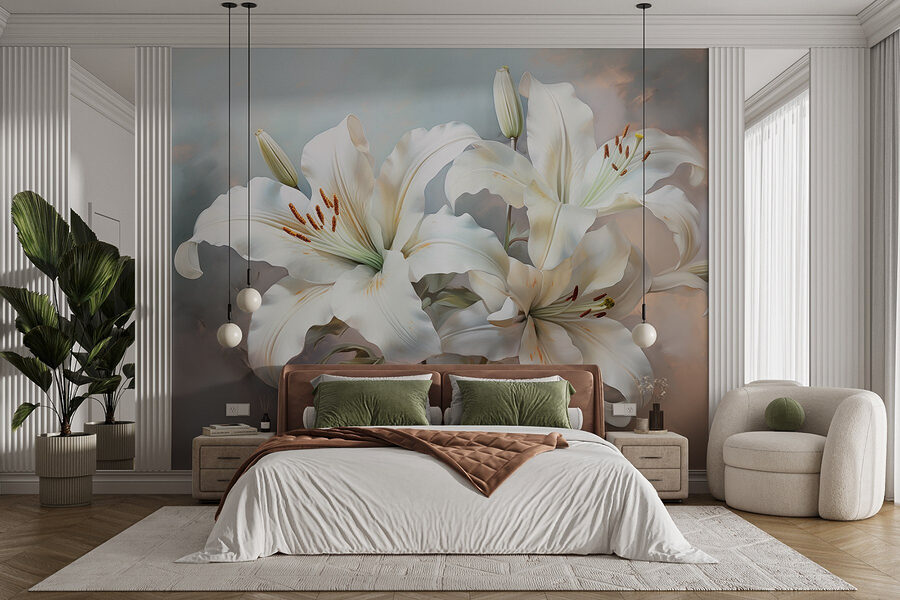 Verwandeln Sie Ihren Raum in einen ruhigen Rückzugsort mit der Fototapete “Delicate Lilies in Soft Hues”. Stellen Sie sich vor, Sie betreten einen Raum, in dem weiche, fließende Lilien Sie begrüßen und Ihnen Eleganz zuflüstern. Die sanften Farben sind wie eine kuschelige Umarmung, perfekt, um die kleine Ecke zu verschönern, in der Sie Ihren Morgenkaffee schlürfen oder sich nach einem langen Tag entspannen. Jeder liebt eine gute Blumengeschichte, und diese Lilien könnten Sie zu Tagträumen von Frühlingspicknicks und gemütlichen Nachmittagen inspirieren. Fügen Sie diese Fototapete hinzu und beobachten Sie, wie sich die Atmosphäre verändert – der Raum wirkt heller und einladender. Es ist, als hätte man einen Garten, der nie verwelkt.