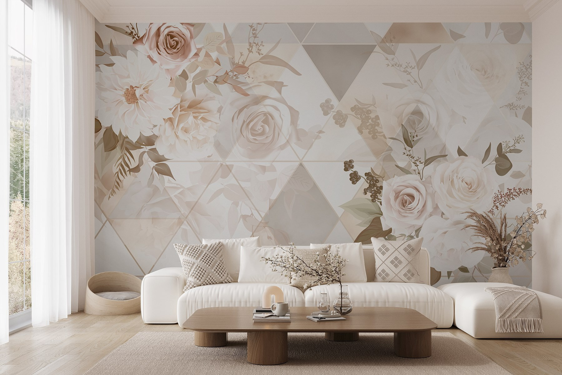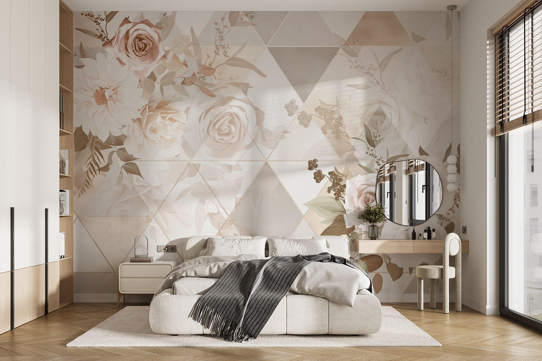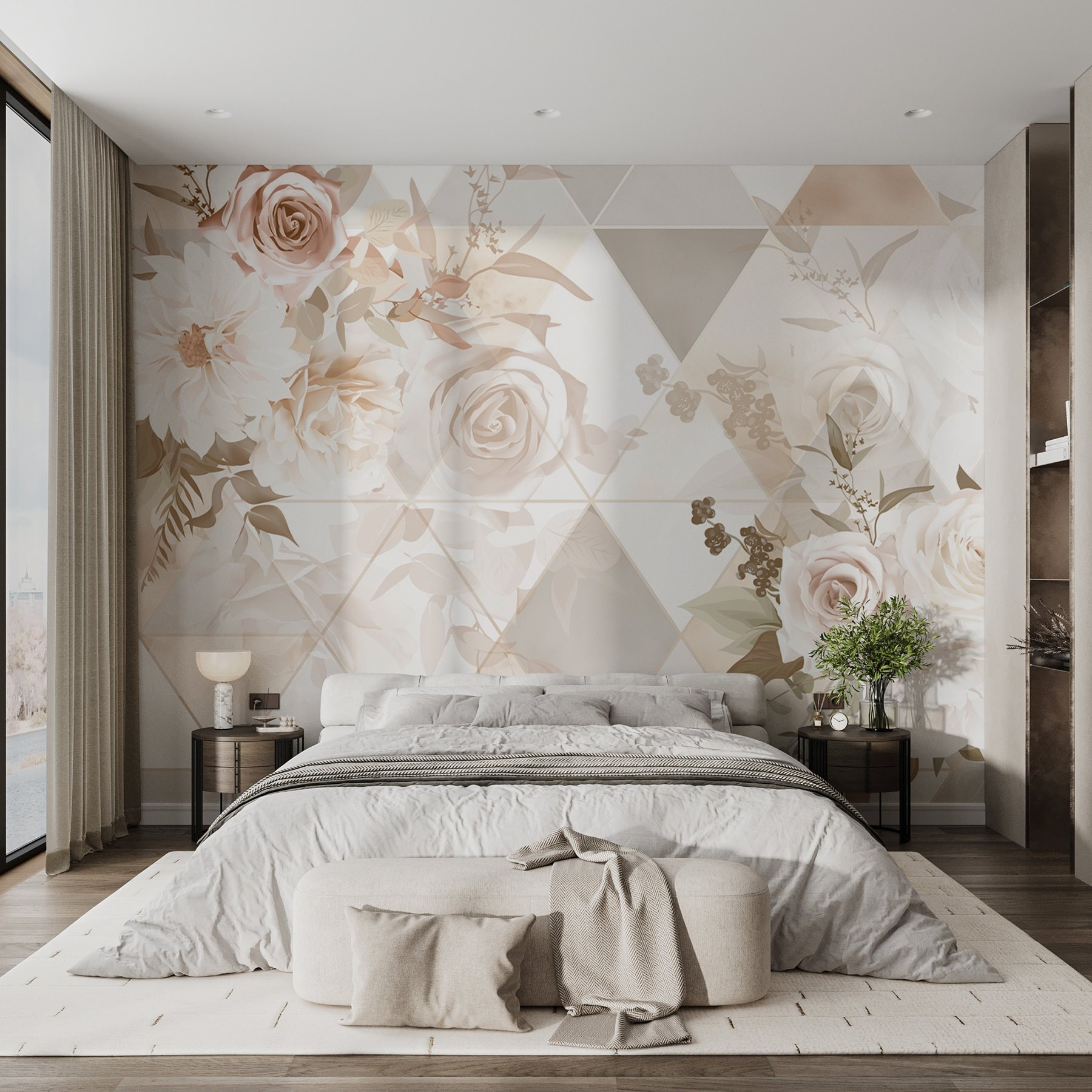 Verwandeln Sie jeden Raum in eine heitere Oase mit dieser atemberaubenden Fototapete, die anmutige Blumen und schicke Dreiecke zeigt. Es ist, als ob man sich einen Garten ins Haus holt, aber ohne den Aufwand des Gießens! Stellen Sie sich vor, Sie nippen an Ihrem Morgenkaffee, während Sie sich in den sanften Farben der Pfingstrosen und Rosen sonnen – das ist eine ganz besondere Stimmung. Diese Fototapete schafft ein perfektes Gleichgewicht zwischen Eleganz und modernem Flair, was sie zu einem herausragenden Element in Wohnräumen oder gemütlichen Ecken macht. Es ist wie eine sanfte Umarmung für Ihre Wände. Nur zu, lassen Sie Ihren Raum erblühen! Wer wünscht sich nicht einen Hauch der Schönheit der Natur in seinem Zuhause?