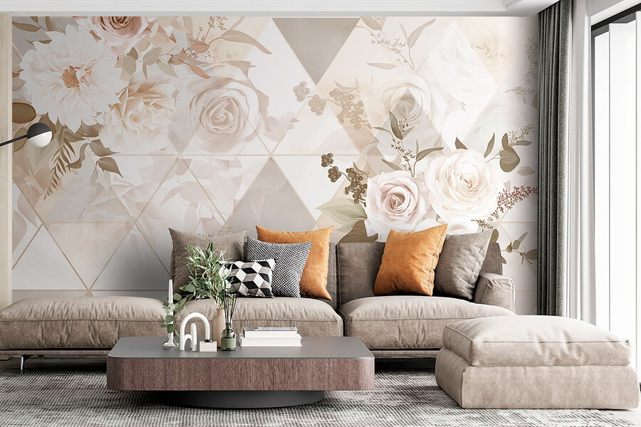 Verwandeln Sie jeden Raum in eine heitere Oase mit dieser atemberaubenden Fototapete, die anmutige Blumen und schicke Dreiecke zeigt. Es ist, als ob man sich einen Garten ins Haus holt, aber ohne den Aufwand des Gießens! Stellen Sie sich vor, Sie nippen an Ihrem Morgenkaffee, während Sie sich in den sanften Farben der Pfingstrosen und Rosen sonnen – das ist eine ganz besondere Stimmung. Diese Fototapete schafft ein perfektes Gleichgewicht zwischen Eleganz und modernem Flair, was sie zu einem herausragenden Element in Wohnräumen oder gemütlichen Ecken macht. Es ist wie eine sanfte Umarmung für Ihre Wände. Nur zu, lassen Sie Ihren Raum erblühen! Wer wünscht sich nicht einen Hauch der Schönheit der Natur in seinem Zuhause?