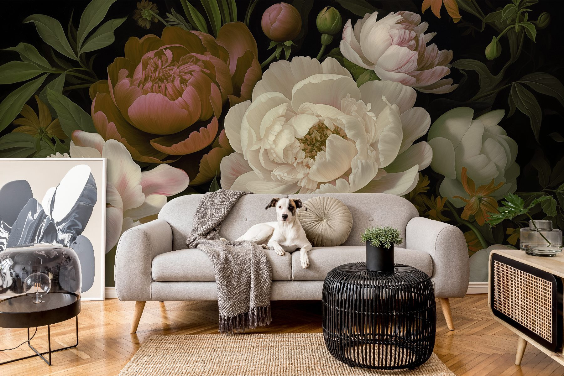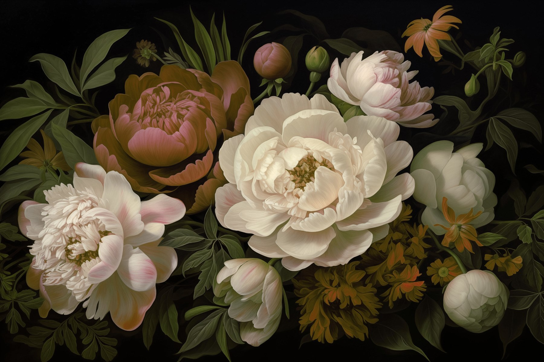 Verwandeln Sie Ihren Raum mit dieser atemberaubenden Fototapete, die eine lebhafte Gruppe von Blumen auf einem satten schwarzen Hintergrund zeigt. Stellen Sie sich vor, Sie betreten einen Raum, in dem Pfingstrosen, Rosen und entzückende kleine Knospen direkt vor Ihren Augen blühen. Diese Fototapete bringt nicht nur Farbe ins Spiel, sie erzählt auch eine Geschichte, so wie bei großen, gemütlichen Familientreffen, bei denen viel gelacht wird. Bei jedem Blick kann man die weichen Blütenblätter fühlen oder einen Hauch des süßen Frühlingsduftes wahrnehmen. Es ist die perfekte Dekoration für eine gemütliche Leseecke oder einen einladenden Eingangsbereich. Wer hätte nicht gern einen unvergänglichen Garten zu Hause?