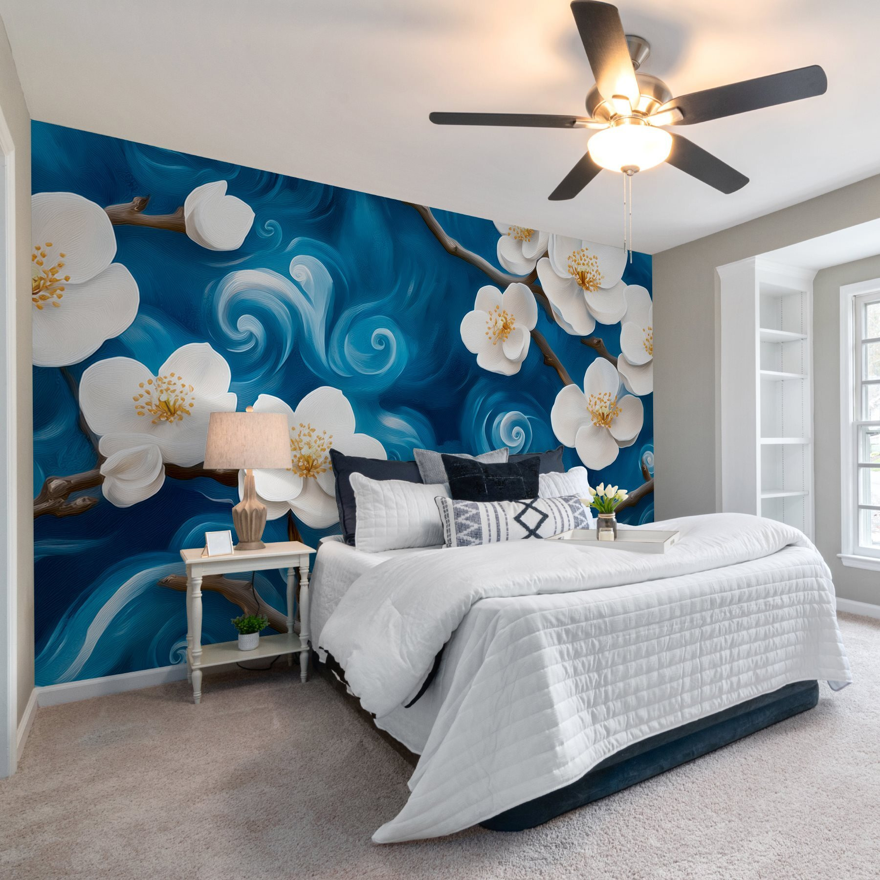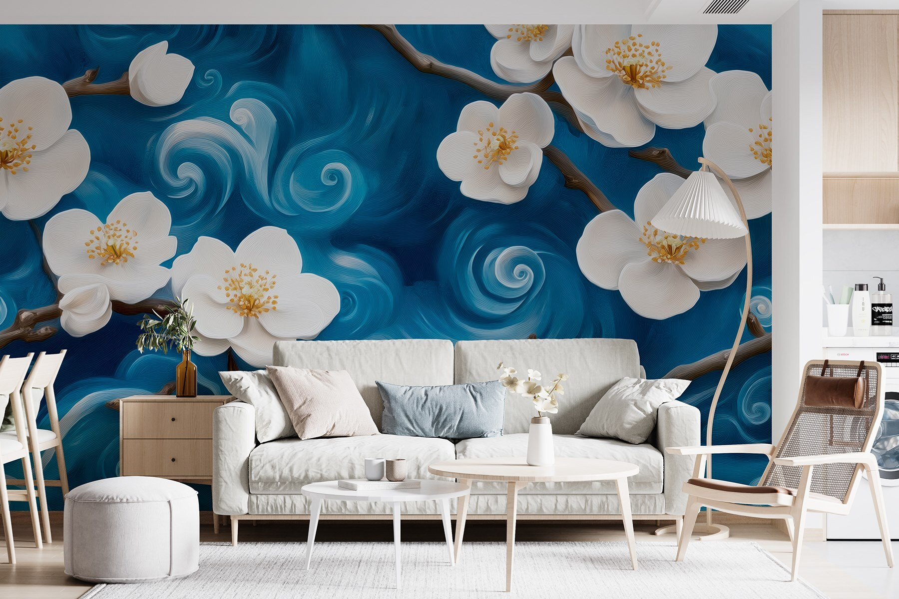 Stellen Sie sich vor, Sie betreten Ihr Zimmer und werden von zarten Blüten begrüßt, die vor einem wirbelnden Hintergrund tanzen – klingt traumhaft, nicht wahr? Diese Wandtapete „Zarte Blüten vor wirbelndem Hintergrund“ bringt den Charme eines japanischen Gartens direkt in Ihren Raum. Der auffällige Kontrast zwischen den zarten weißen Blütenblättern und den tiefblauen Wirbeln schafft eine ruhige und dennoch dynamische Atmosphäre. Es ist, als würde man jedes Mal, wenn man das Zimmer betritt, einen Kurzurlaub machen! Perfekt für Momente, in denen das Chaos der Welt Einzug hält. Stellen Sie sich vor, Sie machen es sich in Ihrem Lieblingssessel bequem, eine Tasse Tee in der Hand. Mit dieser Tapete fällt es leicht, die Hektik draußen zu vergessen und sich in ihrer Schönheit zu verlieren. Auch ein wunderbarer Gesprächsaufhänger – wer würde nicht gerne über einen so atemberaubenden Hintergrund sprechen? Verwandeln Sie Ihre Wände in eine Oase der Ruhe!