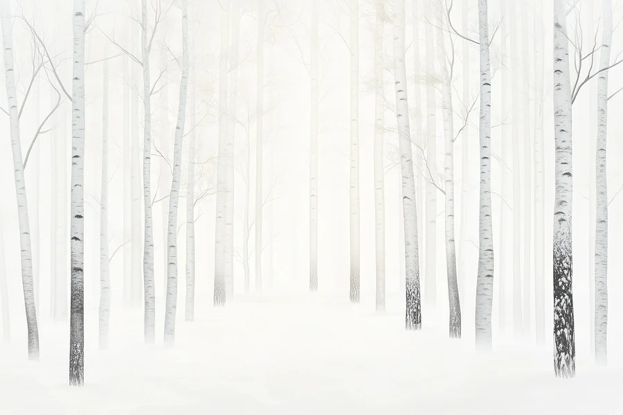 Verwandeln Sie Ihren Raum in ein ruhiges Winterwunderland mit dieser Fototapete, die eine Gruppe von Bäumen in einem verschneiten Wald zeigt. Stellen Sie sich vor, Sie wachen mit einer beruhigenden Szene von Birken auf, deren schlanke Stämme hoch und stolz vor einer weichen, verschneiten Kulisse stehen. Es ist, als ob man sich ein Stück Natur ins Haus holt – kein Schneeschaufeln erforderlich! Diese Fototapete strahlt Ruhe aus und eignet sich daher perfekt für gemütliche Ecken oder ein ruhiges Schlafzimmer. Stellen Sie sich vor, Sie machen es sich mit einem heißen Getränk, weichen Decken und dem sanften Rauschen des draußen fallenden Schnees gemütlich. Ein perfekter Rückzugsort, direkt in Ihrem eigenen Zuhause!
