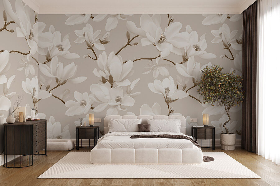 Verwandeln Sie Ihren Raum in eine Oase der Ruhe mit der „Wandtapete Muster aus weißen Blumen“. Stellen Sie sich vor, Sie betreten jedes Mal, wenn Sie den Raum betreten, einen ruhigen Garten – natürliche Eleganz umgibt Ihre Wände. Diese zarten weißen Blüten tanzen vor einem sanften Hintergrund und schaffen eine beruhigende Atmosphäre, die sich frisch und entspannend anfühlt, wie eine sanfte Brise an einem Frühlingstag. Diese Wandtapete ist perfekt für ein gemütliches Wohnzimmer oder ein ruhiges Schlafzimmer und hebt sofort die Stimmung und strahlt Wärme aus. Ihre Gäste werden stehen bleiben, um sie zu bewundern, und vielleicht sogar fragen, wo sie ihr eigenes Stück Blumenparadies bekommen können. Eine perfekte Mischung aus Natur und Kunst – wer hätte gedacht, dass Wanddekoration so lebendig wirken kann?