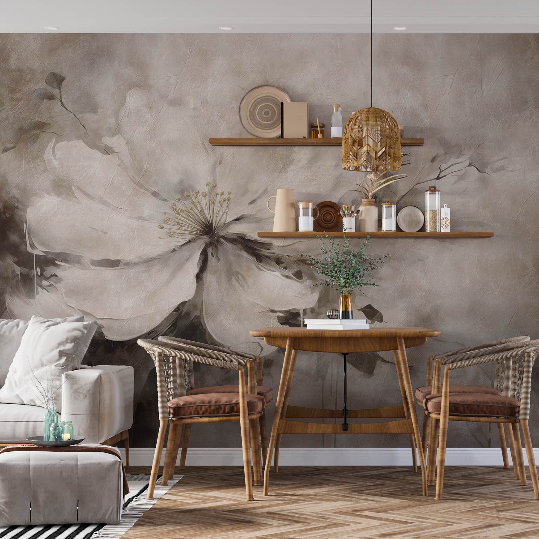 Es eignet sich perfekt, um ein Wohnzimmer aufzupeppen oder eine ruhige Atmosphäre in einem Schlafzimmer zu schaffen. Freunde werden sicherlich innehalten und vielleicht voller Bewunderung fragen, wo Sie es gefunden haben. Inmitten von Gesprächen könnte es sogar zu kleinen Tagträumen anregen und die Unterhaltung auf friedliche Momente, Naturliebhaber oder heiße Tipps von Blumenarrangement-Künstlern lenken! Lassen Sie sich vom Charme dieser Tapete verzaubern und beobachten Sie, wie sich Ihr Raum in ein kleines Stück friedliches Paradies verwandelt!