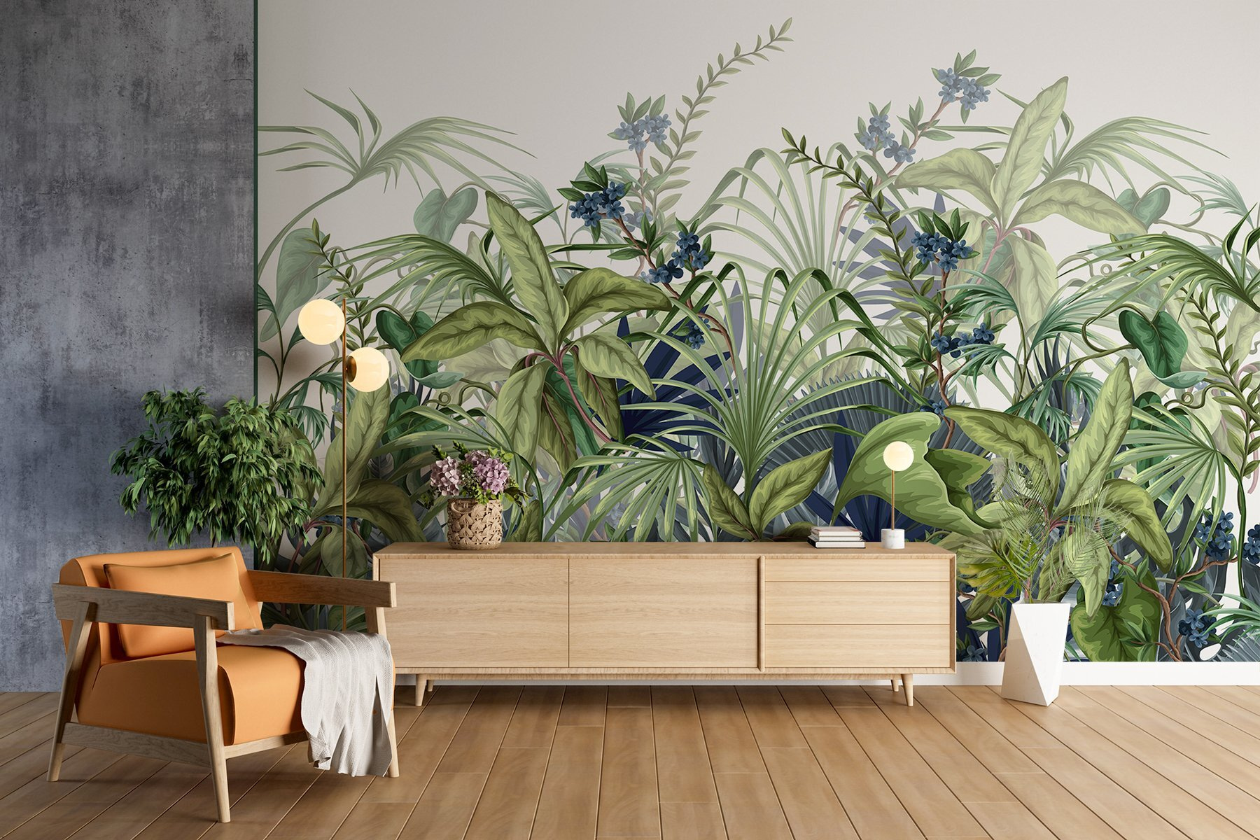 Verwandeln Sie Ihren Raum in eine Oase der Ruhe mit dieser lebendigen Wandtapete „Üppiges Grün schafft eine ruhige Atmosphäre“. Stellen Sie sich vor, Sie betreten einen Raum, in dem Sie jeden Tag üppiges Blattwerk und zarte Blüten begrüßen – das sorgt für sofortige Ruhe! Dieses Design bringt die Frische der Natur in Ihre Innenräume und lässt sogar einen Montag wie einen gemütlichen Wochenendausflug erscheinen. Die Mischung aus lebhaftem Grün und sanftem Blau schafft eine Kulisse, die Entspannung verspricht. Ihre Gäste werden vielleicht glauben, Sie leben in einem tropischen Paradies. Und wer möchte nicht gerne das Gefühl haben, von einem kleinen Wald umgeben zu sein, während er seinen Morgenkaffee trinkt? Perfekt für jeden Raum, der einen Hauch von Wärme braucht – wie ein kleines Stück Naturwunder direkt an Ihrer Wand!