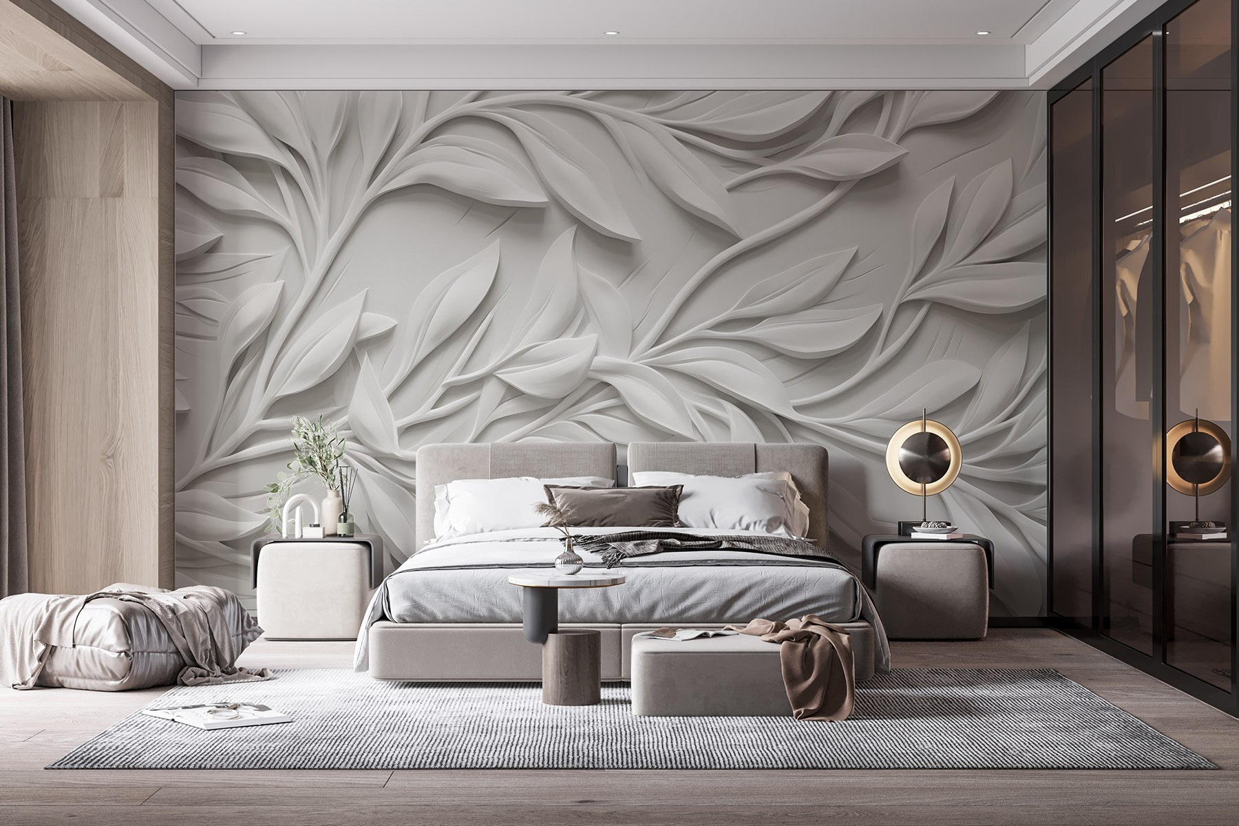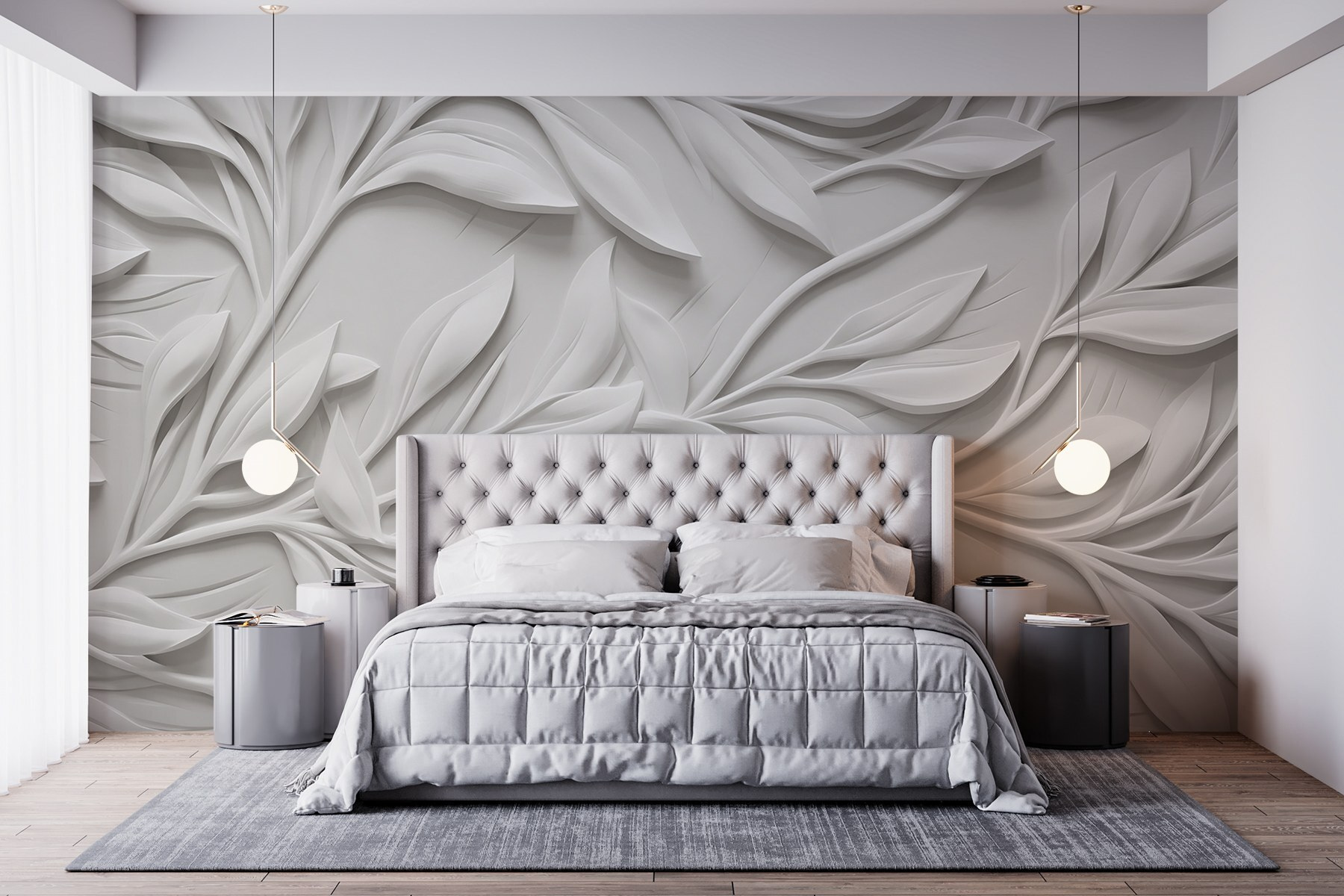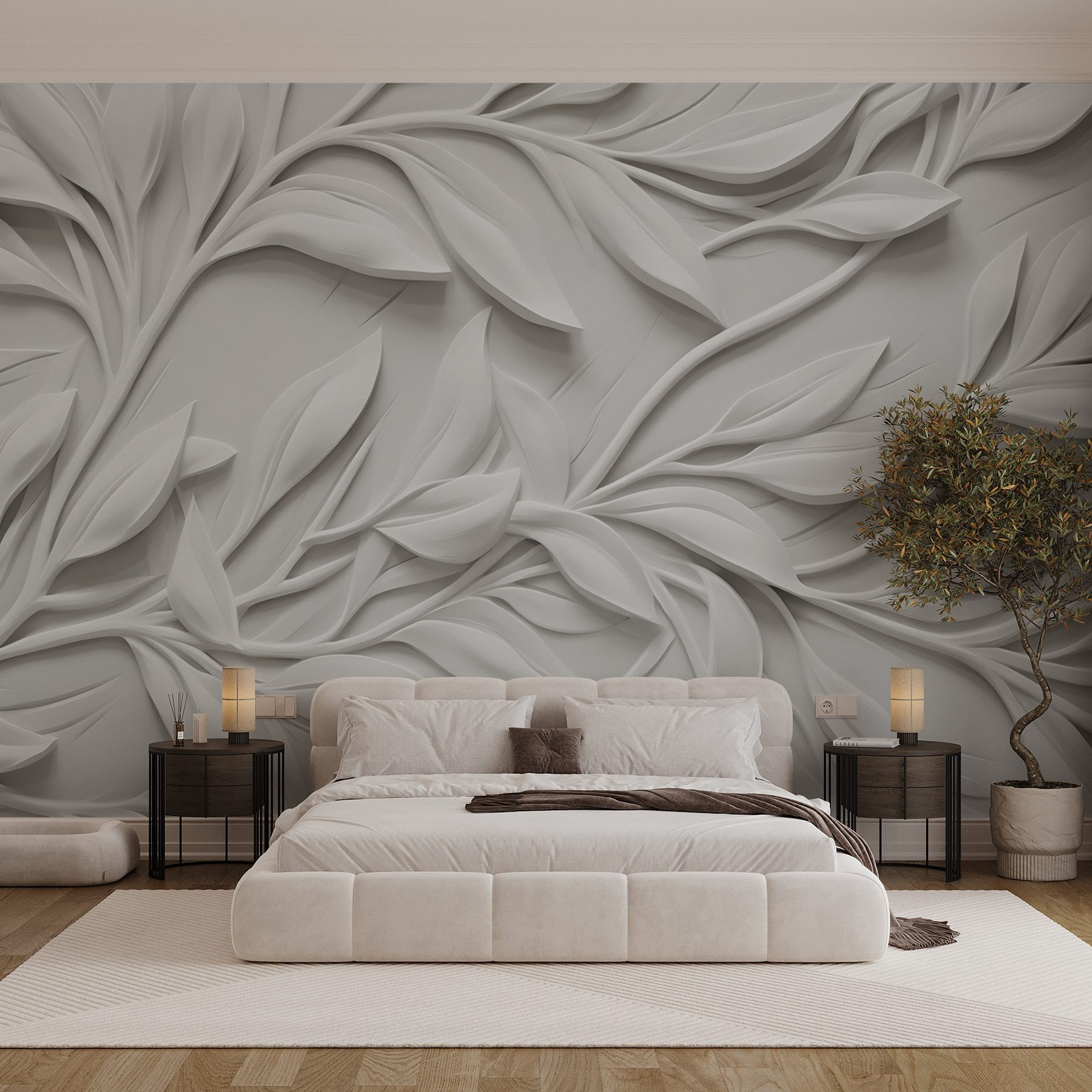 Verwandeln Sie Ihren Raum mit dieser atemberaubenden „Wandtapete Weiße Wand mit Blättern”. Stellen Sie sich vor, Sie betreten einen Raum, in dem weiche, skulpturale Blätter über die Wand zu tanzen scheinen. Es ist, als hätte die Natur einen kleinen Urlaub im Haus gemacht! Der strahlend weiße Hintergrund lässt die filigranen Blattmuster besonders gut zur Geltung kommen und verbreitet eine frische Atmosphäre, die beruhigend und doch schick ist. Ihre Freunde werden vielleicht denken, Sie hätten ein Stück eines wunderschönen Gartens ins Haus geholt. Diese Wandtapete eignet sich perfekt für eine gemütliche Leseecke oder einen eleganten Essbereich und verleiht jedem Raum einen Hauch von Eleganz, der ihn etwas schicker wirken lässt. Können Sie sich vorstellen, wie Sie Tee trinken und dabei die ruhige Schönheit genießen?