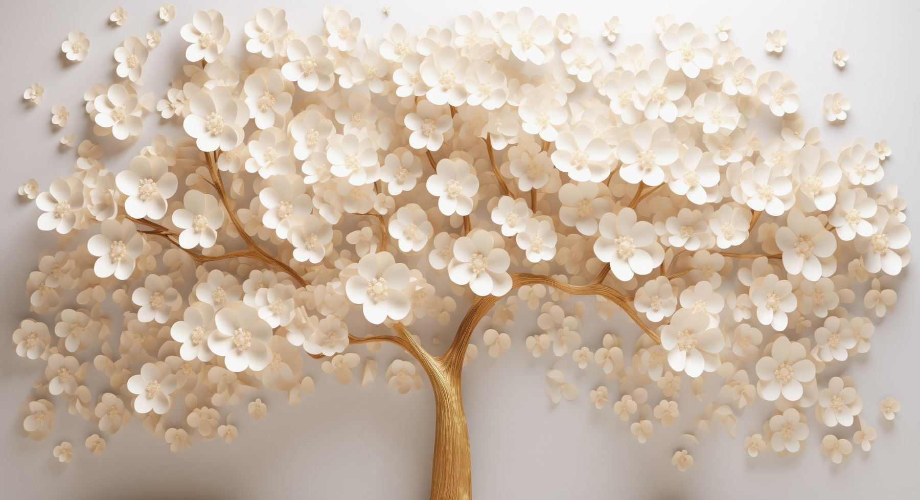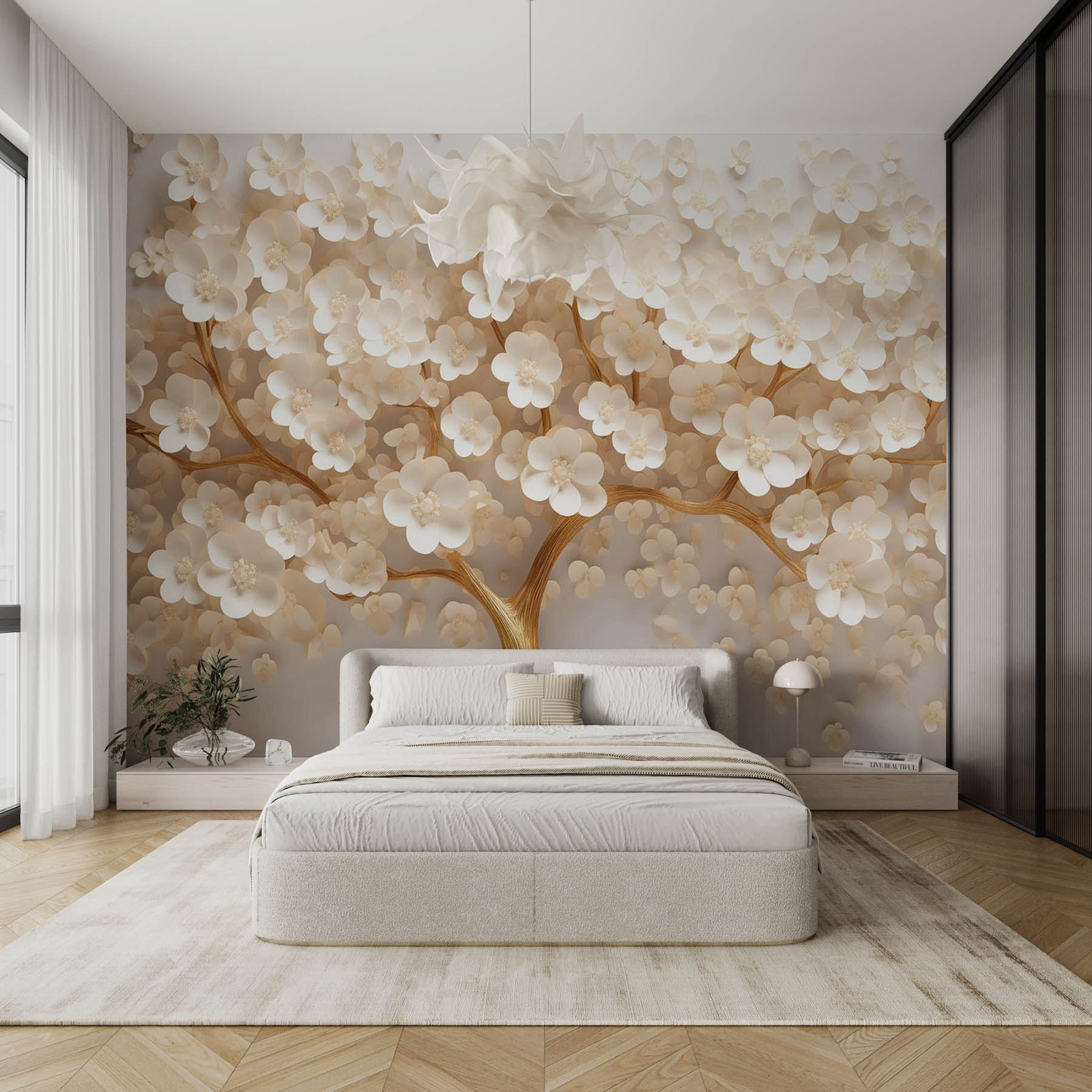 Step into a serene paradise with this enchanting wall mural, “Tree with White Flowers.” Imagine a delicate tree bursting with blossoms, transforming any space into a calm retreat. The soft, creamy petals and sturdy branch create a gentle contrast that’s simply lovely. It’s like having spring indoors all year round—no allergies, though!