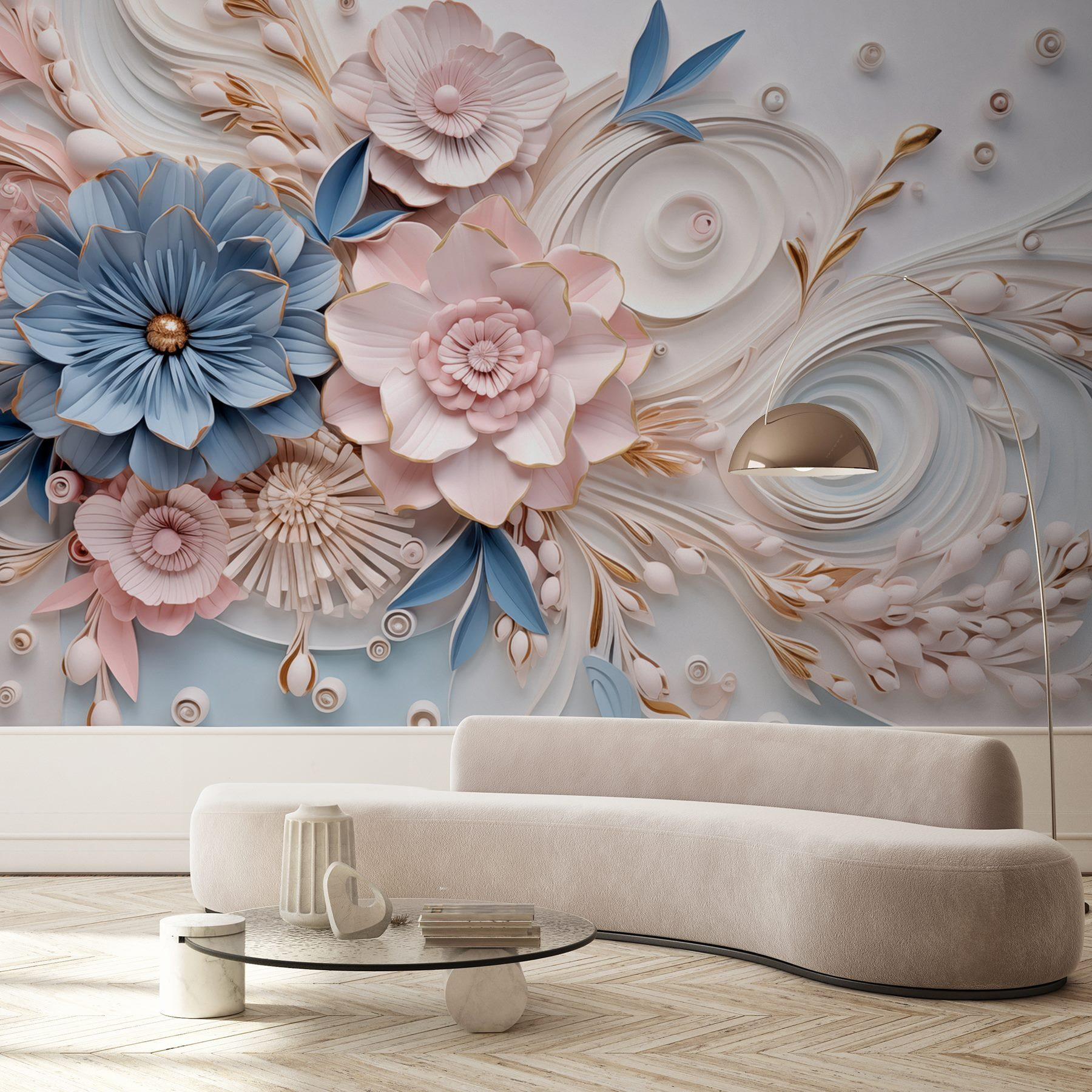 Verwandeln Sie jeden Raum in einen verträumten Rückzugsort mit dieser atemberaubenden Fototapete aus Papierblumen und Blättern. Stellen Sie sich vor, Sie treten jeden Tag in einen ruhigen Garten, in dem zarte Blüten und wirbelnde Blätter über die Wand tanzen. Es ist eine sanfte Erinnerung daran, dass Schönheit überall zu finden ist, sogar in Innenräumen. Die sanften Farben verbreiten eine beruhigende Stimmung, die geradezu zu gemütlichen Nachmittagen mit einer Tasse Tee und einem guten Buch einlädt. Perfekt für ein Wohn- oder Schlafzimmer, ist es, als würde man die Natur ins Haus holen, ohne sich um das Gießen der Pflanzen zu kümmern. Lehnen Sie sich einfach zurück, entspannen Sie sich und lassen Sie dieses Wandbild auf sich wirken.