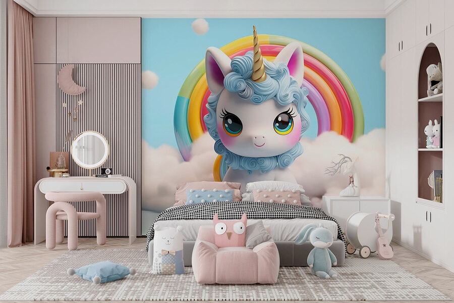 Verwandeln Sie jedes Zimmer in einen wunderlichen Zufluchtsort mit dieser bezaubernden Fototapete, die ein charmantes Spielzeug-Einhorn und einen leuchtenden Regenbogen zeigt. Stellen Sie es sich vor: Kinder kichern und träumen von fantastischen Abenteuern mit ihrem neuen magischen Freund. Die sanften Pastellfarben strahlen eine einladende Wärme aus, so dass es sich wie eine gemütliche Wolke der Freude anfühlt. Es ist perfekt für die Kleinen, die an Glanz und Wunder glauben – denn mal ehrlich, wer würde nicht gerne auf einem Einhorn durch einen regenbogengefüllten Himmel reiten? Dieses Wandbild ist nicht nur Dekoration, es ist eine Eintrittskarte in eine Welt voller Fantasie, in der jeder Tag ein Märchen sein kann. Dekorieren Sie das Kinderzimmer oder das Spielzimmer und beobachten Sie, wie der Raum zum Leben erwacht, ein Lächeln erzeugt und die Kreativität anregt.
