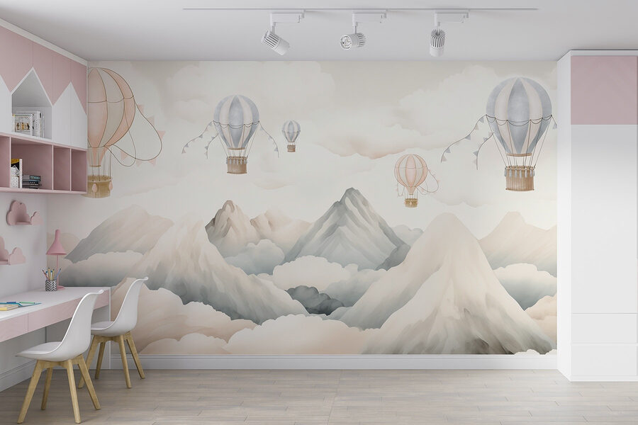 Stellen Sie sich vor, Sie treten in eine Welt ein, in der Heißluftballons träge über majestätischen Bergen schweben, umgeben von weichen, wogenden Wolken. Diese Fototapete bringt eine heitere Stimmung in jeden Raum, als ob Sie aus einem Fenster in eine traumhafte Landschaft blicken würden. Stellen Sie sich eine gemütliche Ecke vor, in der Sie Ihren Morgenkaffee schlürfen und sich von den Abenteuern inspirieren lassen, die hinter Ihren Wänden warten. Die sanften Pastellfarben laden zu Wärme und Ruhe ein und eignen sich perfekt für ein Kinderzimmer oder einen entspannten Wohnbereich. Es ist die Art von Wandbild, die zu Tagträumen anregt und dazu einlädt, die einfachen Freuden des Lebens zu genießen – wie das Schweben in die Lüfte.