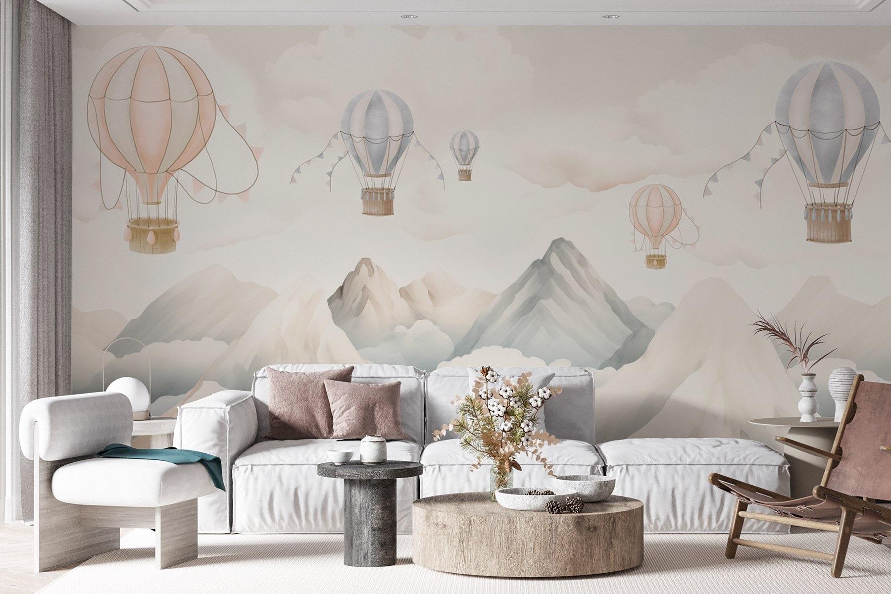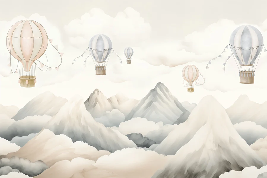 Stellen Sie sich vor, Sie treten in eine Welt ein, in der Heißluftballons träge über majestätischen Bergen schweben, umgeben von weichen, wogenden Wolken. Diese Fototapete bringt eine heitere Stimmung in jeden Raum, als ob Sie aus einem Fenster in eine traumhafte Landschaft blicken würden. Stellen Sie sich eine gemütliche Ecke vor, in der Sie Ihren Morgenkaffee schlürfen und sich von den Abenteuern inspirieren lassen, die hinter Ihren Wänden warten. Die sanften Pastellfarben laden zu Wärme und Ruhe ein und eignen sich perfekt für ein Kinderzimmer oder einen entspannten Wohnbereich. Es ist die Art von Wandbild, die zu Tagträumen anregt und dazu einlädt, die einfachen Freuden des Lebens zu genießen – wie das Schweben in die Lüfte.