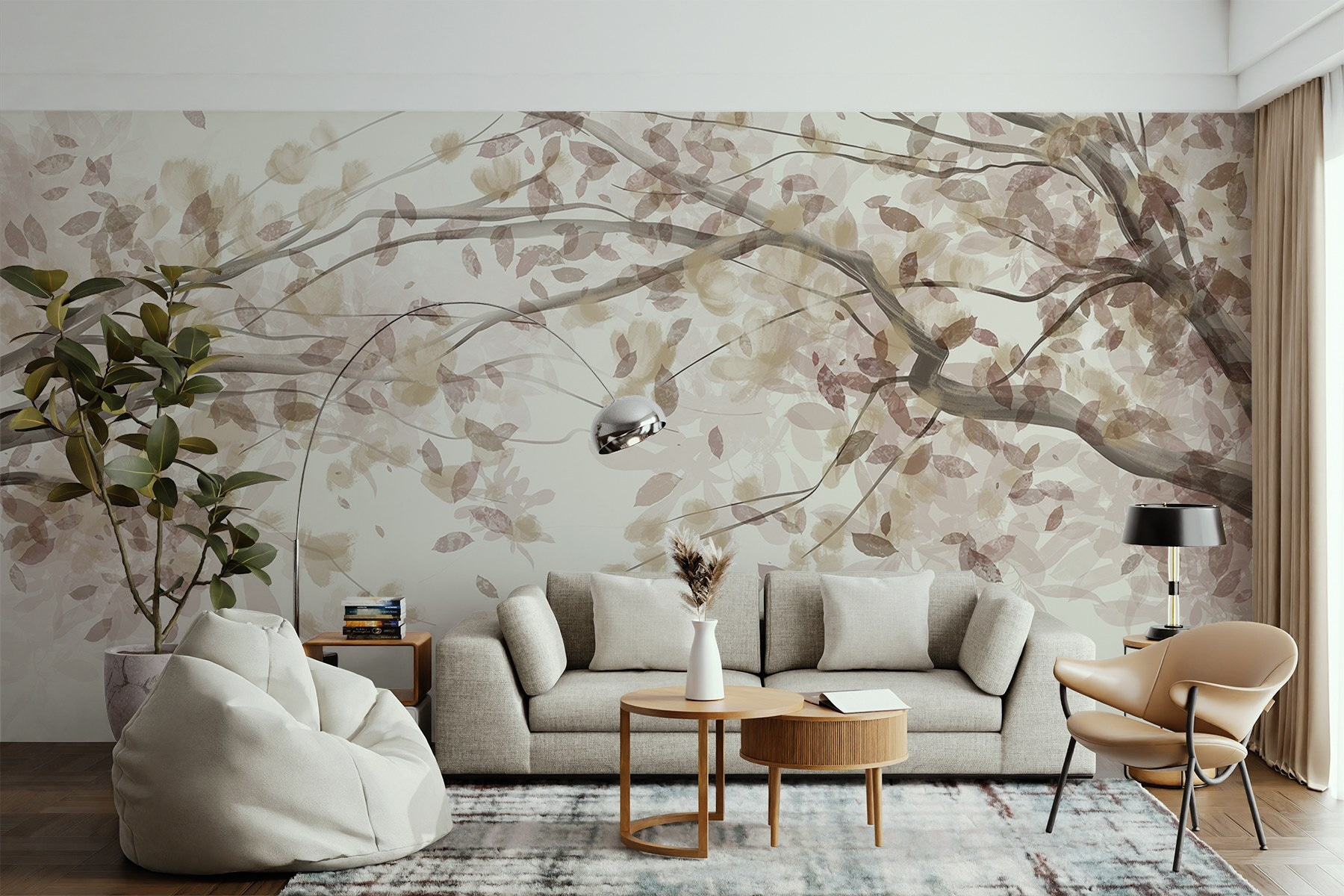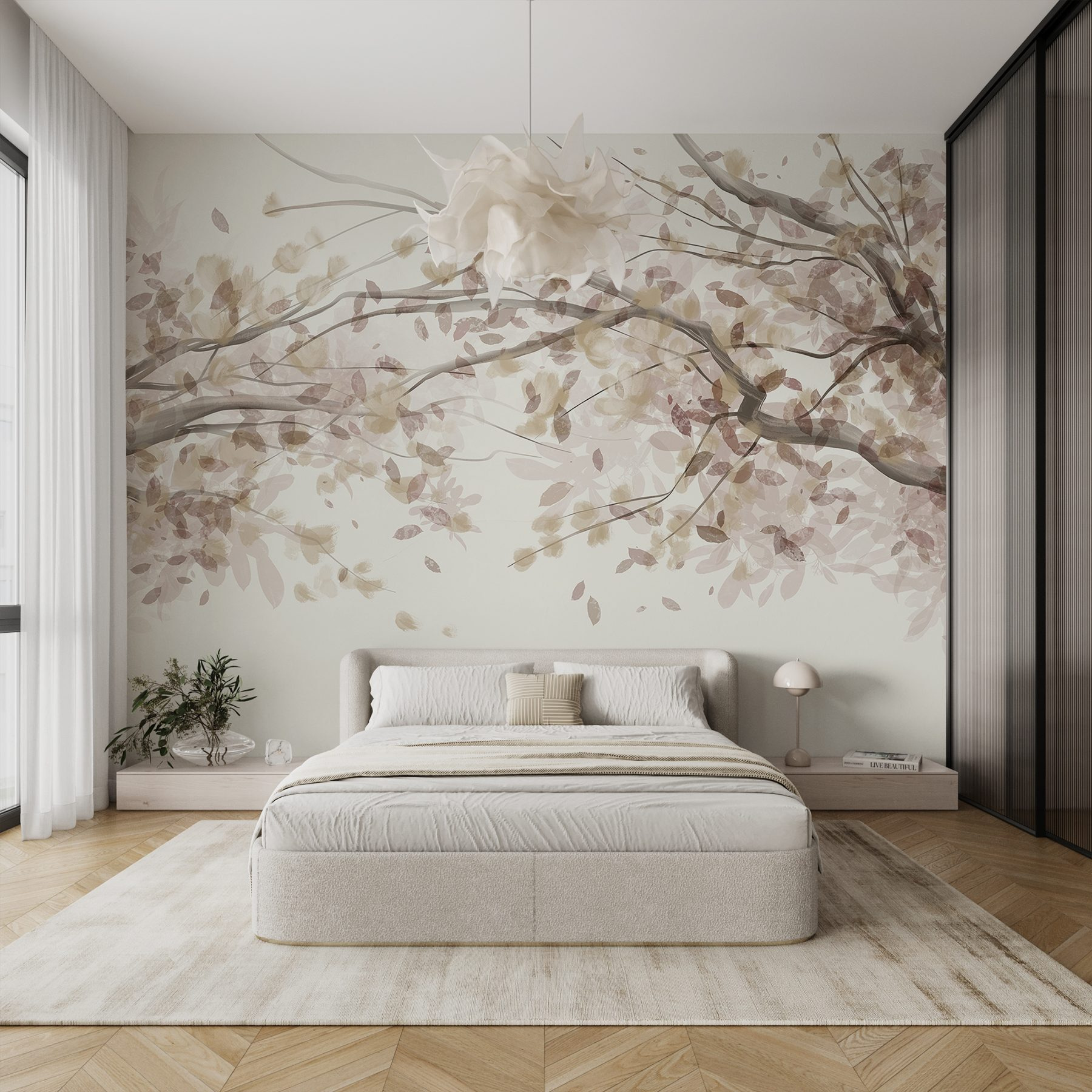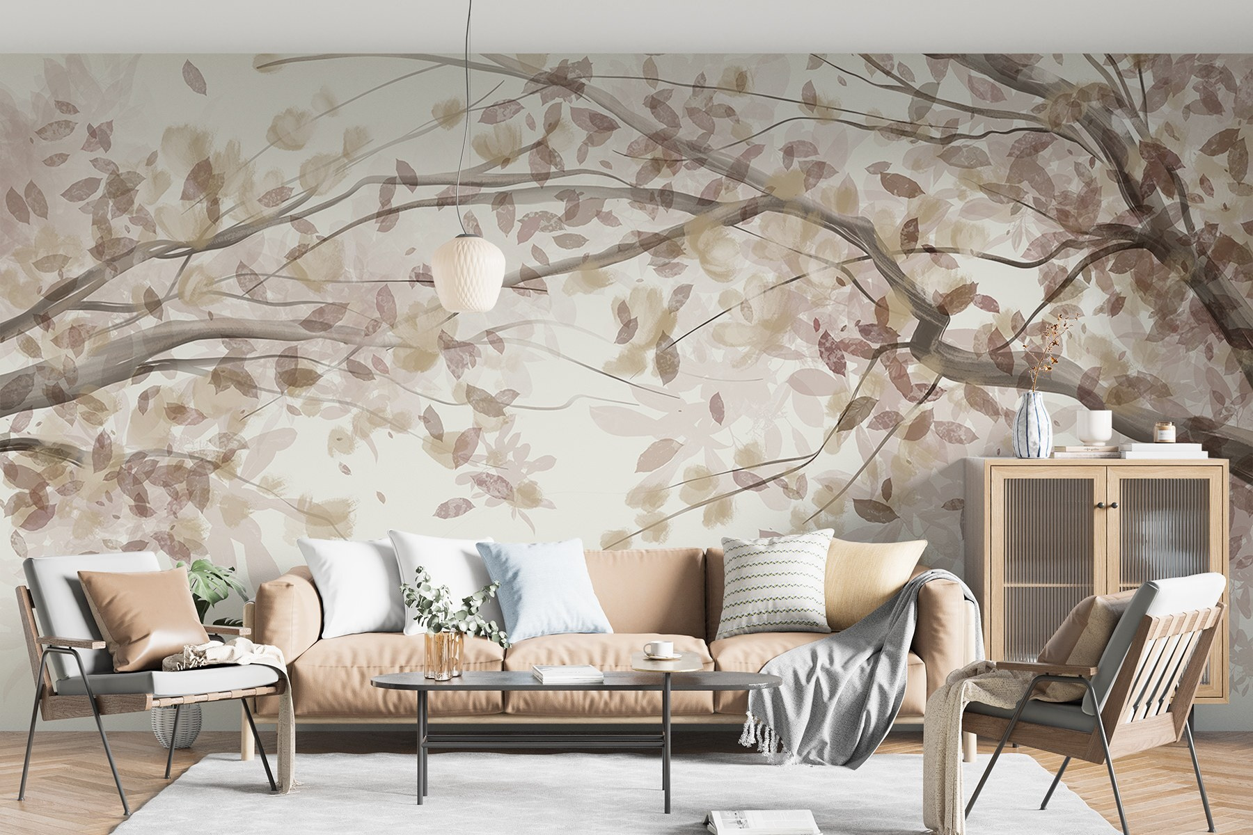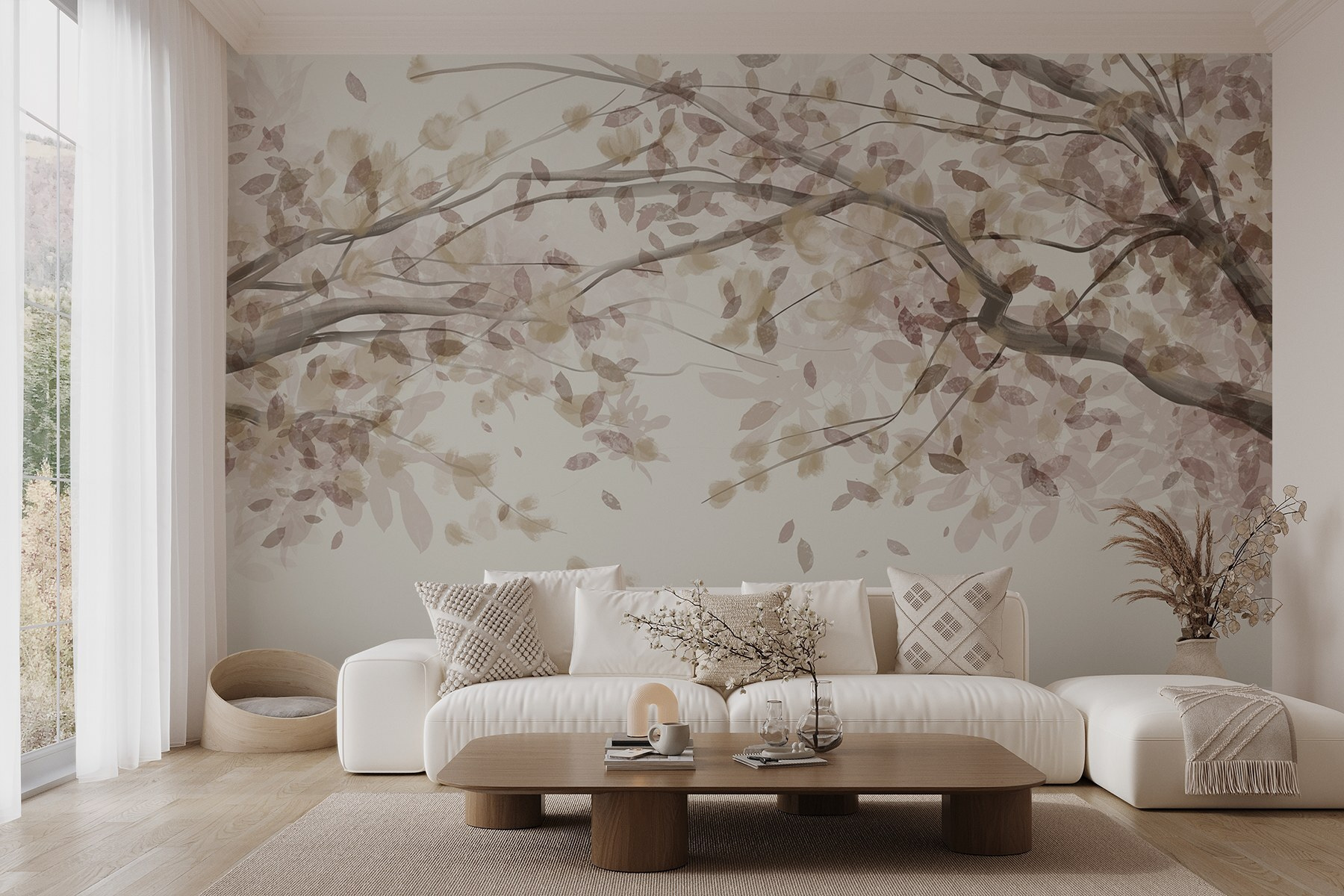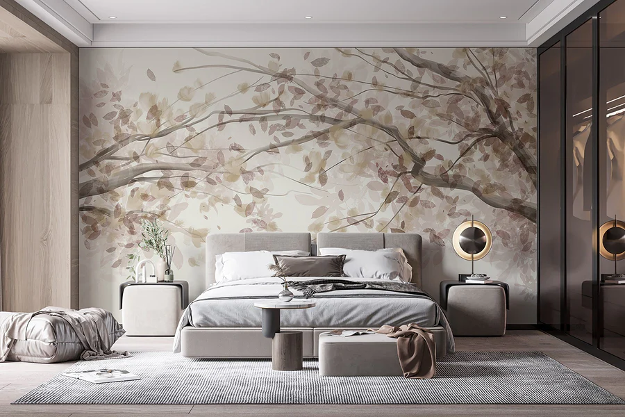 Verändern Sie jeden Raum mit dieser bezaubernden Fototapete, die den Charme von mit Blättern geschmückten Ästen einfängt. Stellen Sie sich vor, Sie treten in einen ruhigen japanischen Garten ein, ohne Ihr Haus zu verlassen. Die sanften Farbtöne schaffen eine beruhigende Kulisse, die Ruhe ausstrahlt und gleichzeitig die Anmut der Natur widerspiegelt. Es ist perfekt für eine gemütliche Leseecke oder eine beruhigende Atmosphäre im Schlafzimmer. Stellen Sie sich diese Momente der stillen Besinnung vor, vielleicht mit einer heißen Tasse Tee in der Nähe. Wer braucht schon einen Rückzugsort in der Natur, wenn diese Fototapete die Ruhe direkt ins Haus bringt? Naturliebhaber und Dekorationsliebhaber werden sich in seine subtile Eleganz verlieben!