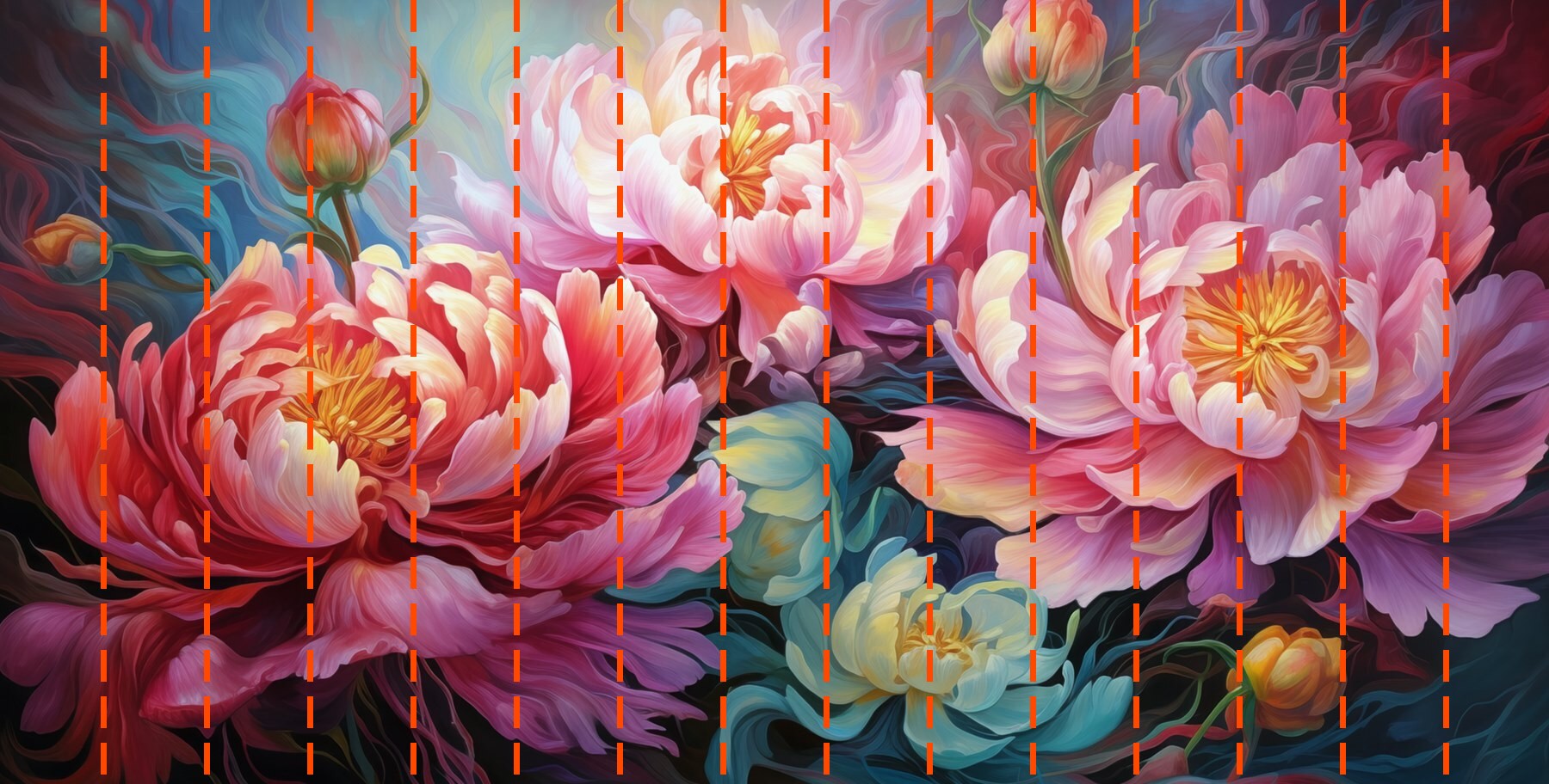 Ihre Tapete wird nach den von Ihnen während des Bestellvorgangs angegebenen Maßen angefertigt. Die Leinwand wird in praktische Abschnitte von jeweils bis zu 50 cm Breite unterteilt.