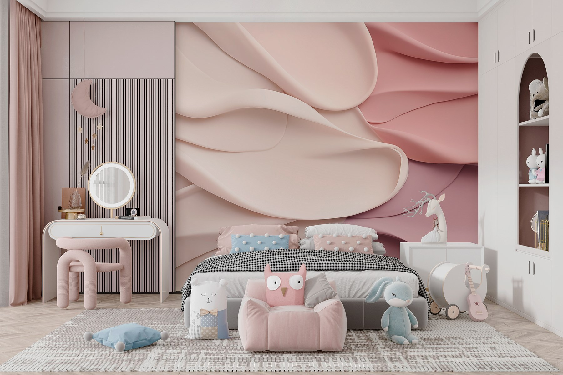 Verändern Sie jeden Raum mit dieser bezaubernden Fototapete, die einen verspielten Tanz aus rosa und weißem, gewelltem Stoff zeigt. Stellen Sie sich vor, Sie betreten einen Raum, der sich wie eine kuschelige Umarmung anfühlt, in dem weiche Wellen ein Gefühl von Ruhe und Komfort erzeugen. Es ist, als ob Sie sich ein Stück sanfte Eleganz in Ihr Zuhause holen. Dieses Wandbild eignet sich perfekt für eine Leseecke oder ein ruhiges Schlafzimmer und kann zu ruhigen Momenten inspirieren – stellen Sie sich vor, Sie machen es sich mit einem guten Buch gemütlich, während Sie von seiner beruhigenden Ausstrahlung umgeben sind. Wer würde nicht eine Kulisse lieben, die sich wie eine kuschelige Decke an den Wänden anfühlt? Es ist Kunst zum Anfassen, ein Gesprächsanlass, der Wärme spendet, ohne zu erdrücken. Egal, ob es sich um eine größere Renovierung oder nur eine kleine Auffrischung handelt, dieses Wandbild verleiht Ihrem Raum ein einzigartiges Gefühl.