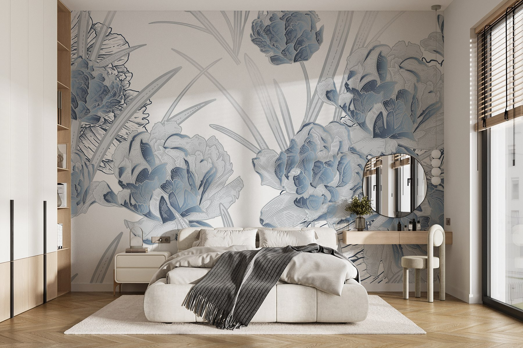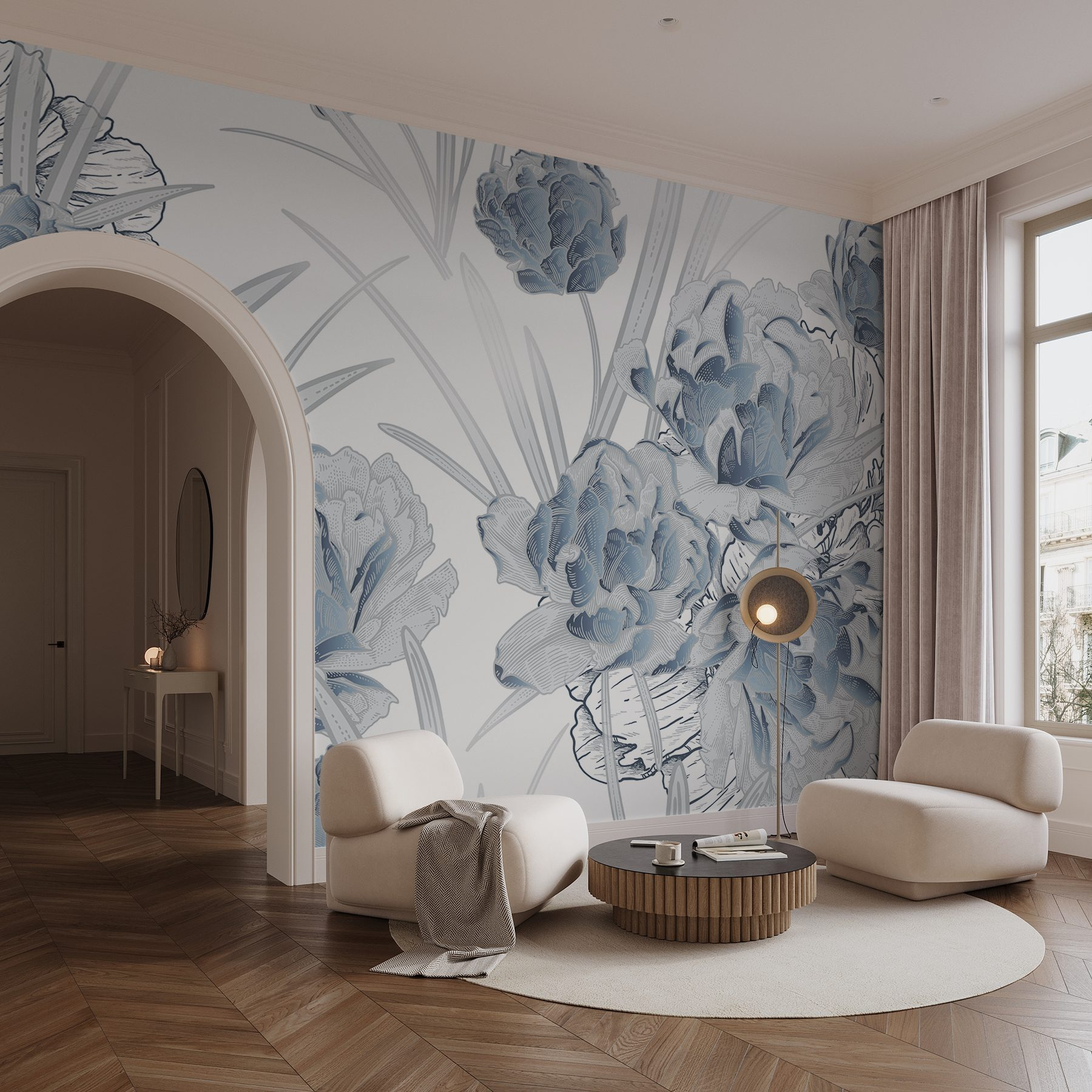Verwandeln Sie jeden Raum mit den bezaubernden “Delicate Blooms in Soft Hues”. Es ist, als hätte man seinen eigenen kleinen Garten im Haus, ohne dass man einen grünen Daumen braucht. Stellen Sie sich vor: Sie wachen mit einer Wand auf, die mit zarten Blüten in Blautönen belebt ist, die einladend und gelassen wirken und jeden Moment ein bisschen besonderer machen. Ob in Ihrer gemütlichen Leseecke oder in einer belebten Küche, diese Fototapete verleiht Ihnen einen Hauch von Schönheit, der mühelos schick wirkt. Ihre Freunde werden Sie vielleicht sogar fragen, ob Sie einen Dekorateur engagiert haben, und wer muss schon zugeben, dass es einfach eine fabelhafte Wand ist? Die feinen Linien und sanften Töne schaffen ein verträumtes Ambiente, das Sie wie eine warme Umarmung an einem kühlen Tag umgibt.