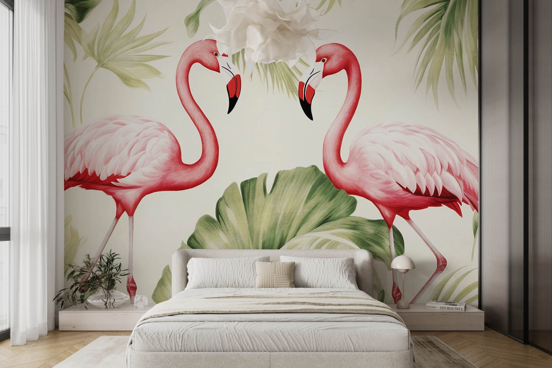 Fototapeten Ein Paar rosa Flamingos mit grünen Blättern Fototapeten Ein Paar rosa Flamingos mit grünen Blättern