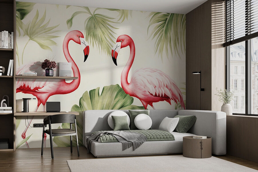 Fototapeten Ein Paar rosa Flamingos mit grünen Blättern Fototapeten Ein Paar rosa Flamingos mit grünen Blättern