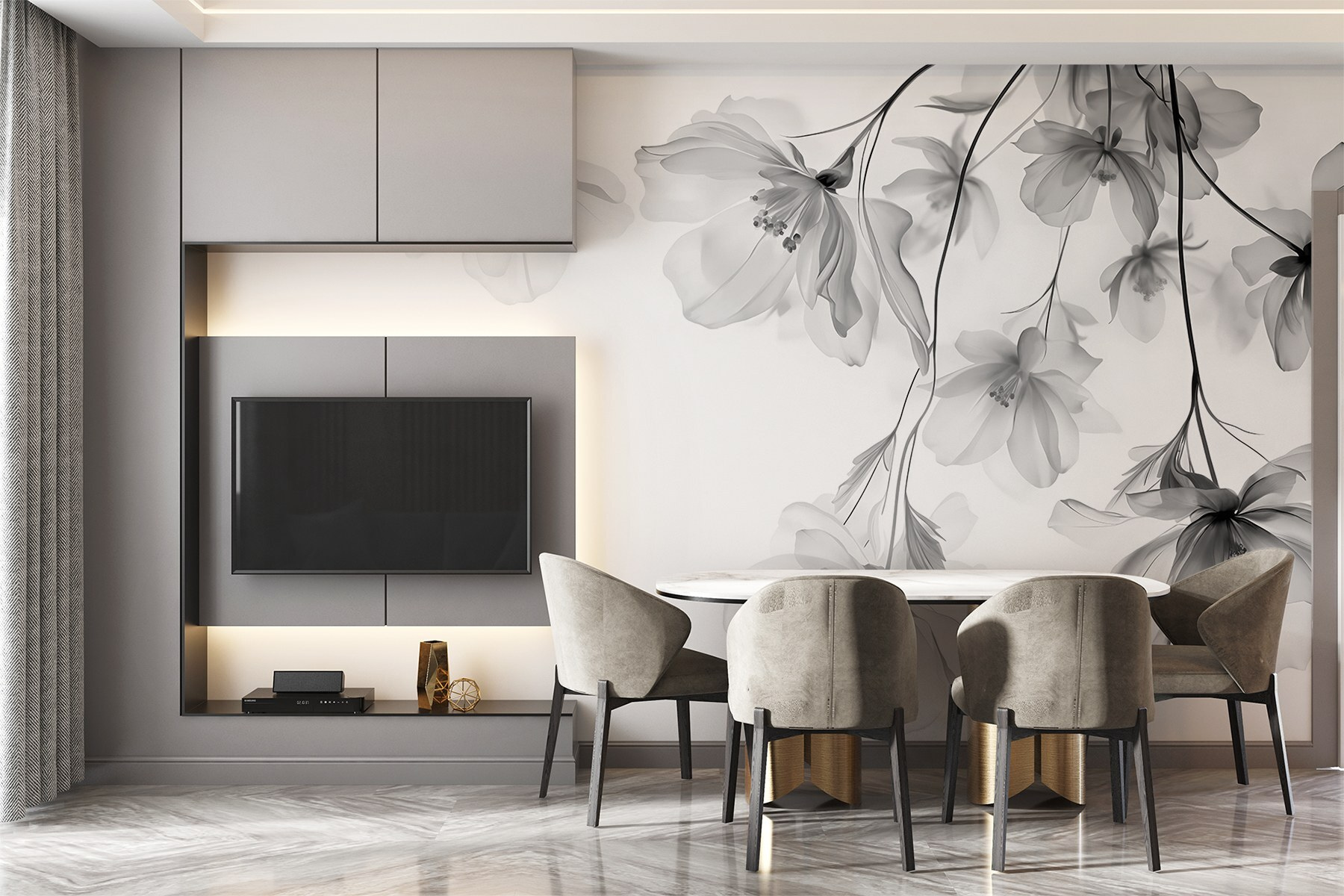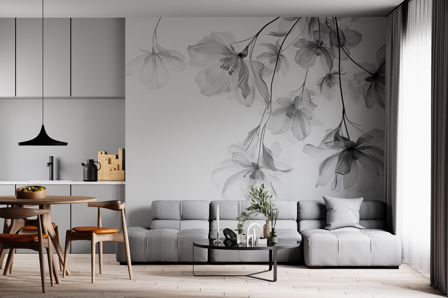 Verwandeln Sie jede Wand in einen ruhigen Zufluchtsort mit dieser atemberaubenden Fototapete, die zarte Blumen in sanften monochromen Farbtönen zeigt. Stellen Sie sich vor, wie Sie an einem ruhigen Morgen einen Kaffee schlürfen, nur Sie und dieses Kunstwerk, das ein Gefühl der Ruhe in Ihren Raum bringt. Das sanfte Fließen der Blüten schafft eine verträumte Atmosphäre, die perfekt für eine gemütliche Leseecke oder ein ruhiges Schlafzimmer ist. Es ist, als ob man einen Hauch von frischer Luft ins Haus holt, ohne zu niesen! Dieses Wandbild dekoriert nicht nur, es erzählt eine Geschichte von Einfachheit und Eleganz und erinnert jeden daran, die Schönheit des Schlichten zu schätzen. Perfekt für alle, die eine einzigartige Dekoration lieben, die Freude macht.