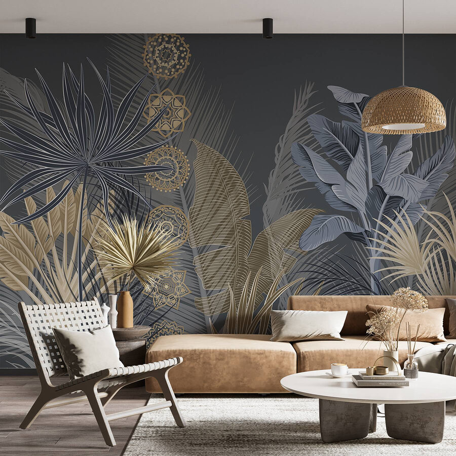 Verwandeln Sie jeden Raum in eine gemütliche Oase mit dieser heiteren botanischen Fototapete vor einem dunklen Hintergrund. Stellen Sie sich vor, Sie betreten Ihren Raum und werden von üppigen Farnen und auffälligen Blättern begrüßt, die sich fast mit einer sanften Brise zu wiegen scheinen. Es ist, als würde man sich ein Stück Natur ins Haus holen, ohne Gießkanne und schlammige Schuhe.