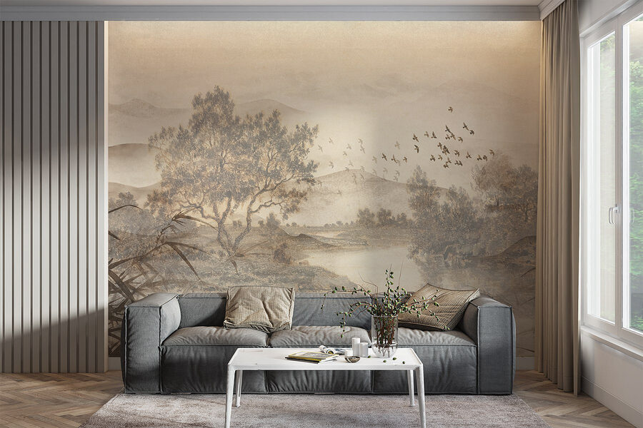 Verwandeln Sie jeden Raum in einen ruhigen Zufluchtsort mit diesem fesselnden Wandbild, das eine ruhige Landschaft mit Bäumen und einem sanften Fluss zeigt. Stellen Sie sich vor, Sie wachen mit den sanften Farbtönen der Natur auf – es ist, als ob Sie sich ein Stück Natur ins Haus holen. Die Aquarellmalerei verleiht dem Bild einen verträumten Touch, perfekt, um den Geist nach einem langen Tag zu beruhigen. Stellen Sie sich vor, Sie schlürfen einen Kaffee, während Sie die verspielten Vögel beobachten, die an Ihnen vorbeifliegen, oder Sie schaffen die perfekte Kulisse für eine gemütliche Leseecke. Diese Fototapete erinnert an friedliche Momente und faule Nachmittage. Es ist nicht nur Kunst, sondern ein Erlebnis, das Ihren Raum erhellen wird.