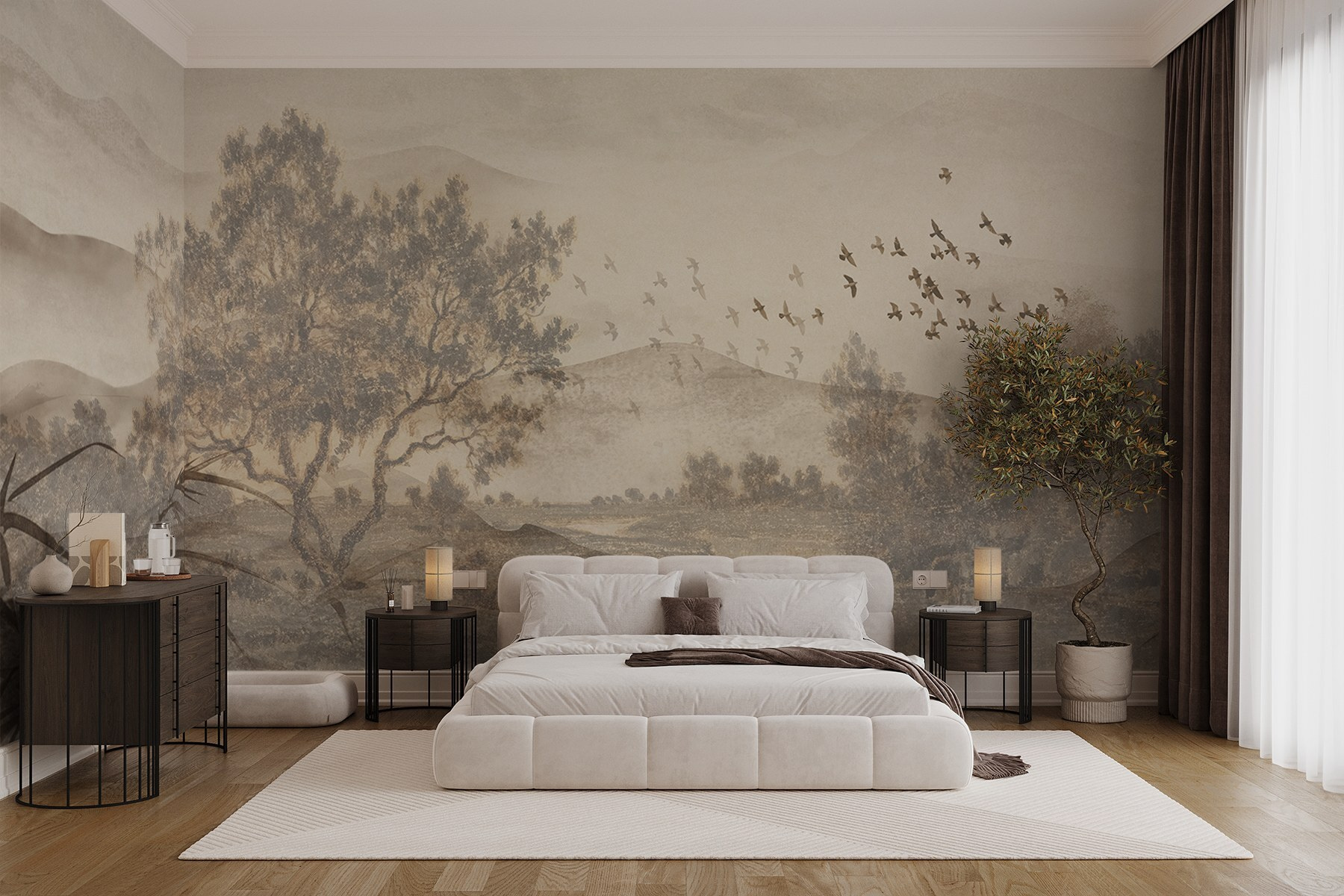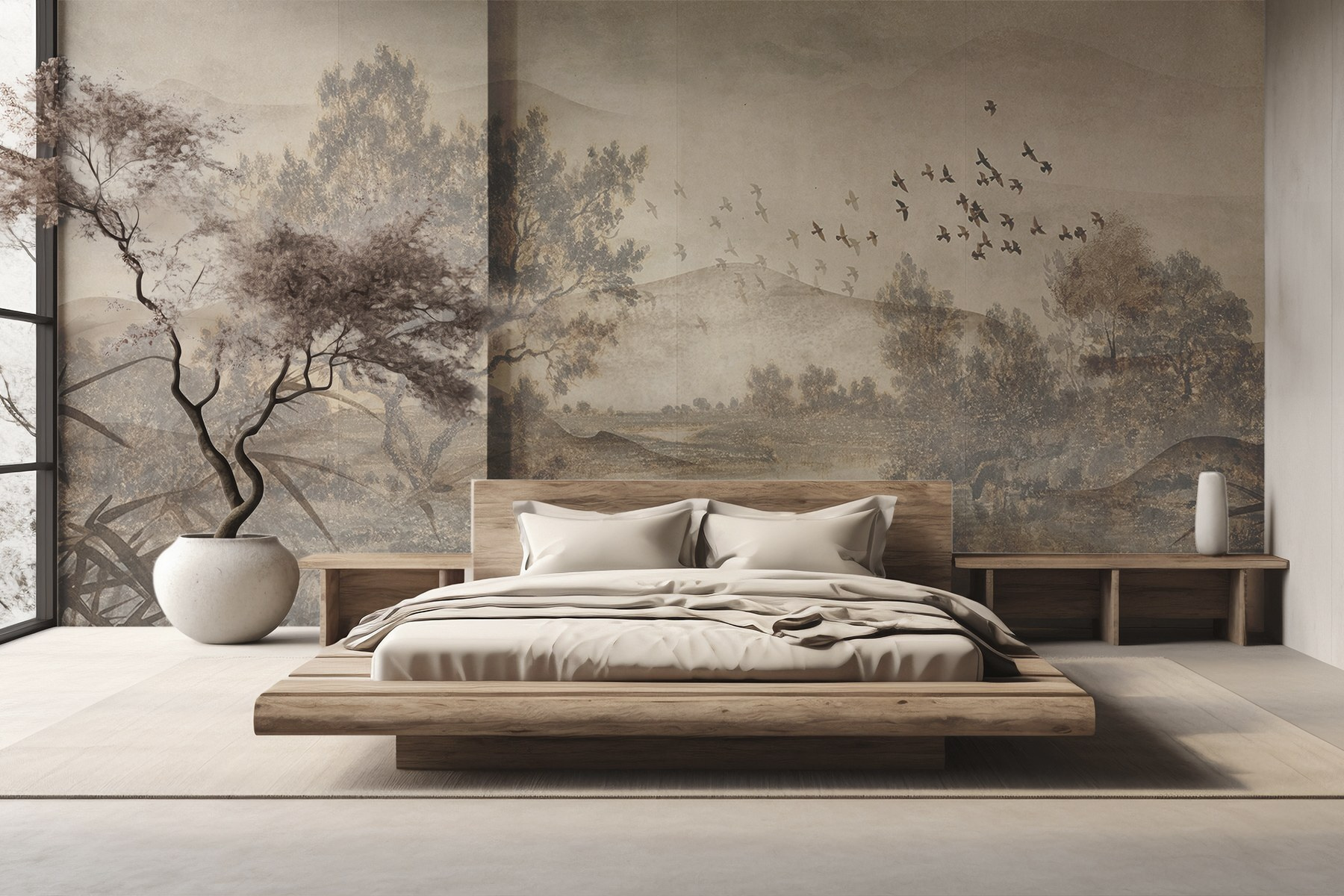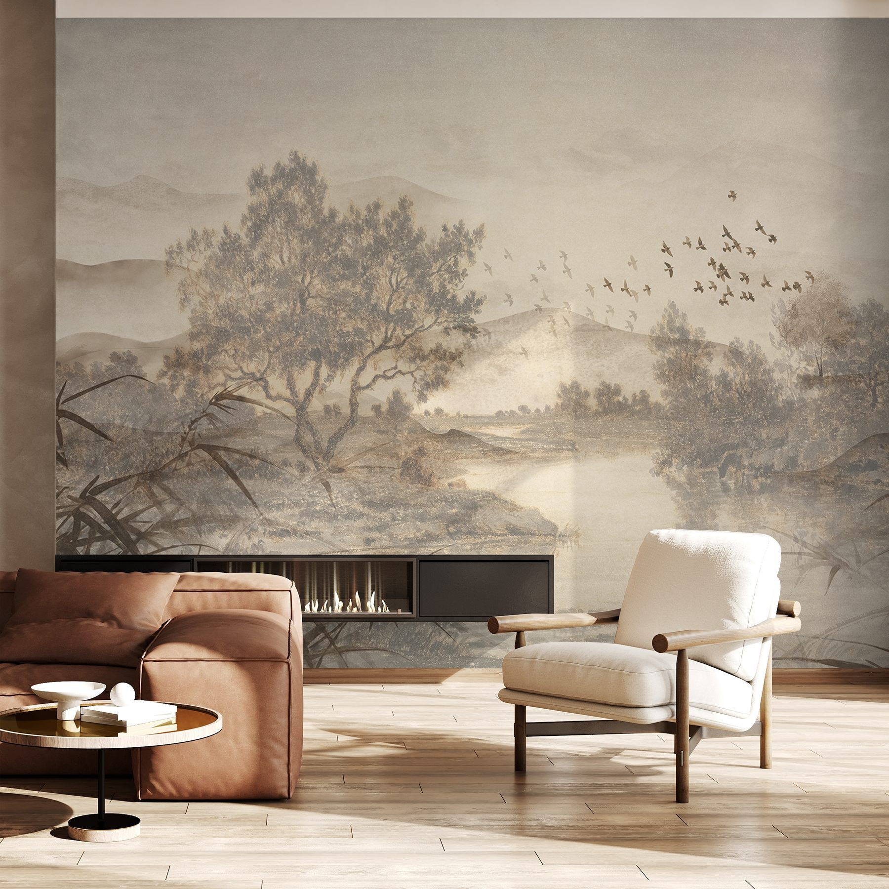 Verwandeln Sie jeden Raum in einen ruhigen Zufluchtsort mit diesem fesselnden Wandbild, das eine ruhige Landschaft mit Bäumen und einem sanften Fluss zeigt. Stellen Sie sich vor, Sie wachen mit den sanften Farbtönen der Natur auf – es ist, als ob Sie sich ein Stück Natur ins Haus holen. Die Aquarellmalerei verleiht dem Bild einen verträumten Touch, perfekt, um den Geist nach einem langen Tag zu beruhigen. Stellen Sie sich vor, Sie schlürfen einen Kaffee, während Sie die verspielten Vögel beobachten, die an Ihnen vorbeifliegen, oder Sie schaffen die perfekte Kulisse für eine gemütliche Leseecke. Diese Fototapete erinnert an friedliche Momente und faule Nachmittage. Es ist nicht nur Kunst, sondern ein Erlebnis, das Ihren Raum erhellen wird.