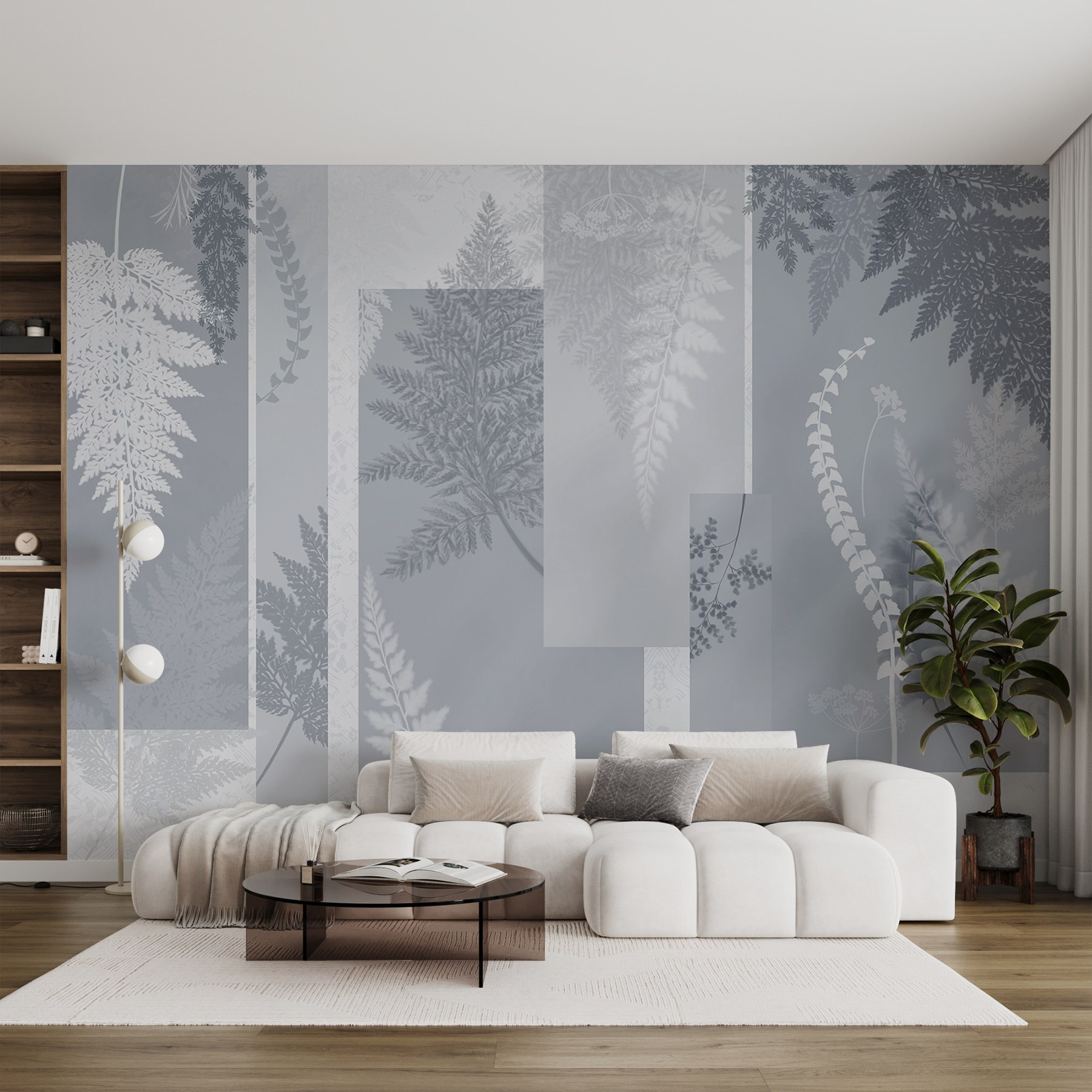 Verwandeln Sie jeden Raum mit diesem bezaubernden grauen und weißen Wandbild mit Blumenmuster. Es ist, als ob Sie einen Hauch von Wald in Ihr Zuhause bringen – ohne die lästigen Mücken. Die zarten Muster von Farnen und Blättern wirbeln in einem beruhigenden Tanz umher und eignen sich perfekt für gemütliche Räume oder lebhafte Versammlungen. Stellen Sie sich vor, Sie schlürfen einen Kaffee, während das Sonnenlicht die zarten Muster beleuchtet und eine sanfte Atmosphäre schafft. Es ist die Art von Dekoration, die Raffinesse ausstrahlt und dennoch sehr einladend wirkt. Mit dieser Fototapete wird jede Wand zu einem friedlichen Rückzugsort – wer würde sich das nicht wünschen?