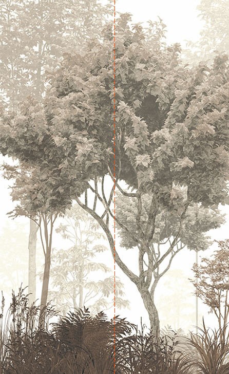 Fototapeten Nebliger Wald mit Bäumen und Pflanzen