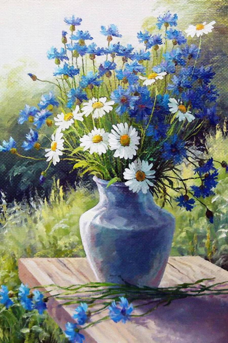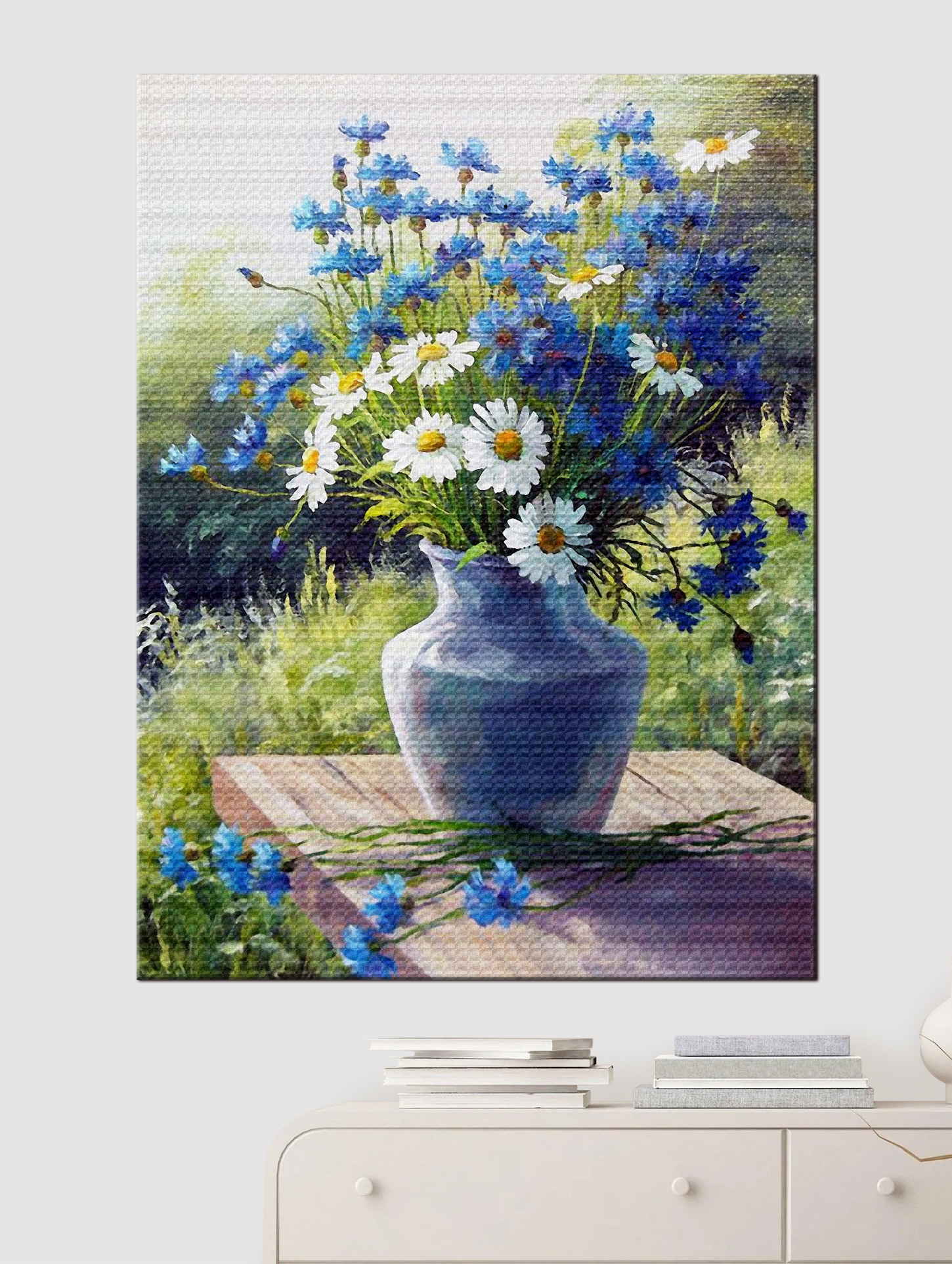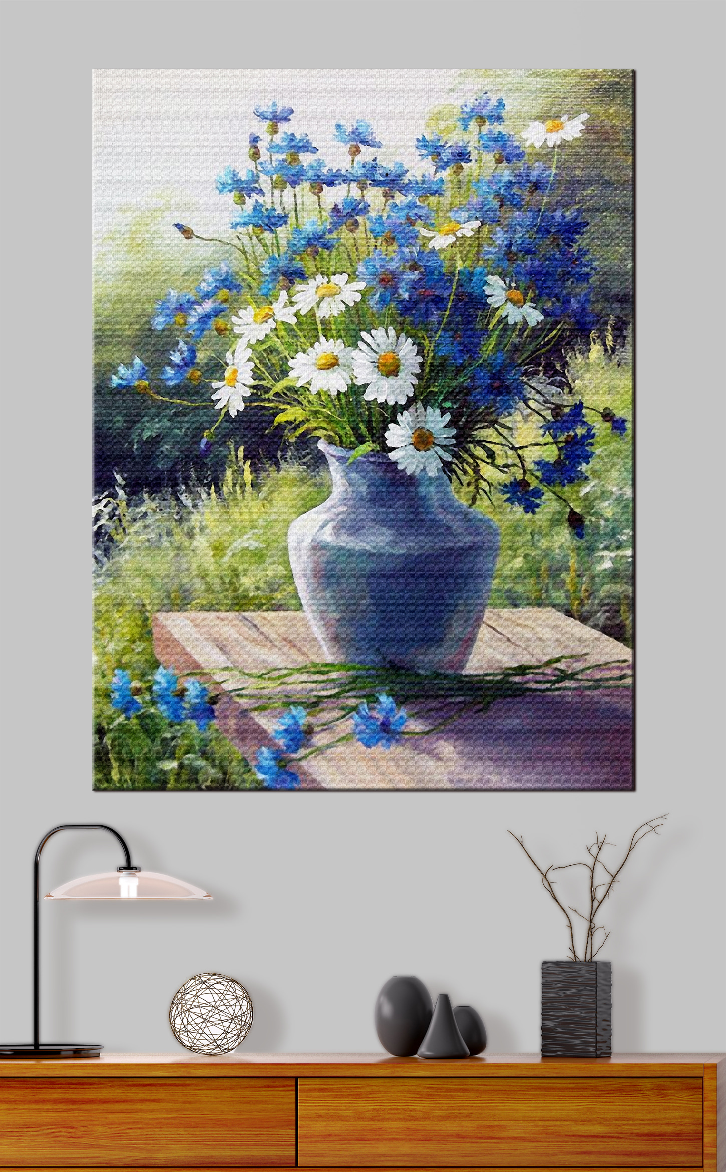 Stellen Sie sich vor: ein friedlicher Morgen, das Sonnenlicht fällt durch Ihr Fenster und prallt an einem wunderschönen Bild aus blauen Kornblumen und fröhlichen Gänseblümchen in einer Vase ab. Ja, so schön ist es. Dieser Leinwanddruck ist nicht nur ein Farbtupfer, sondern erzählt eine ganze Geschichte. Perfekt für Ihr Wohnzimmer, Ihr Schlafzimmer oder die einsame Wand, die Sie schon lange verschönern wollten. Es bringt ein Stück Natur ins Haus – ganz ohne Pollen! Die Blau- und Weißtöne heben sich von einem sanften grünen Hintergrund ab, so dass die Blumen fast so aussehen, als ob sie sich in einer leichten Brise wiegen würden. Bei jedem Blick darauf lächelt man und fühlt sich ein bisschen leichter, fast so, als ob man einen kleinen Spaziergang über eine Sommerwiese gemacht hätte. Ribbit. Moment, das sind Frösche. Bzzz. Jetzt sind es Bienen. Wie auch immer, es ist wie Frühling auf der Leinwand. Freundlich und einladend, wie ein Gespräch mit einem alten Freund.