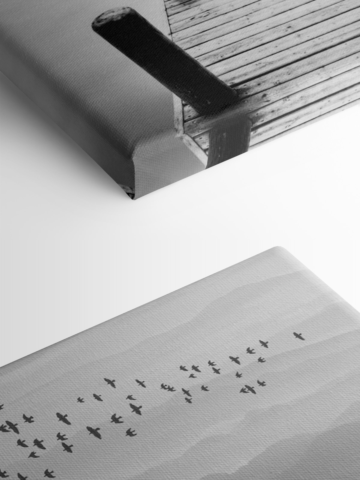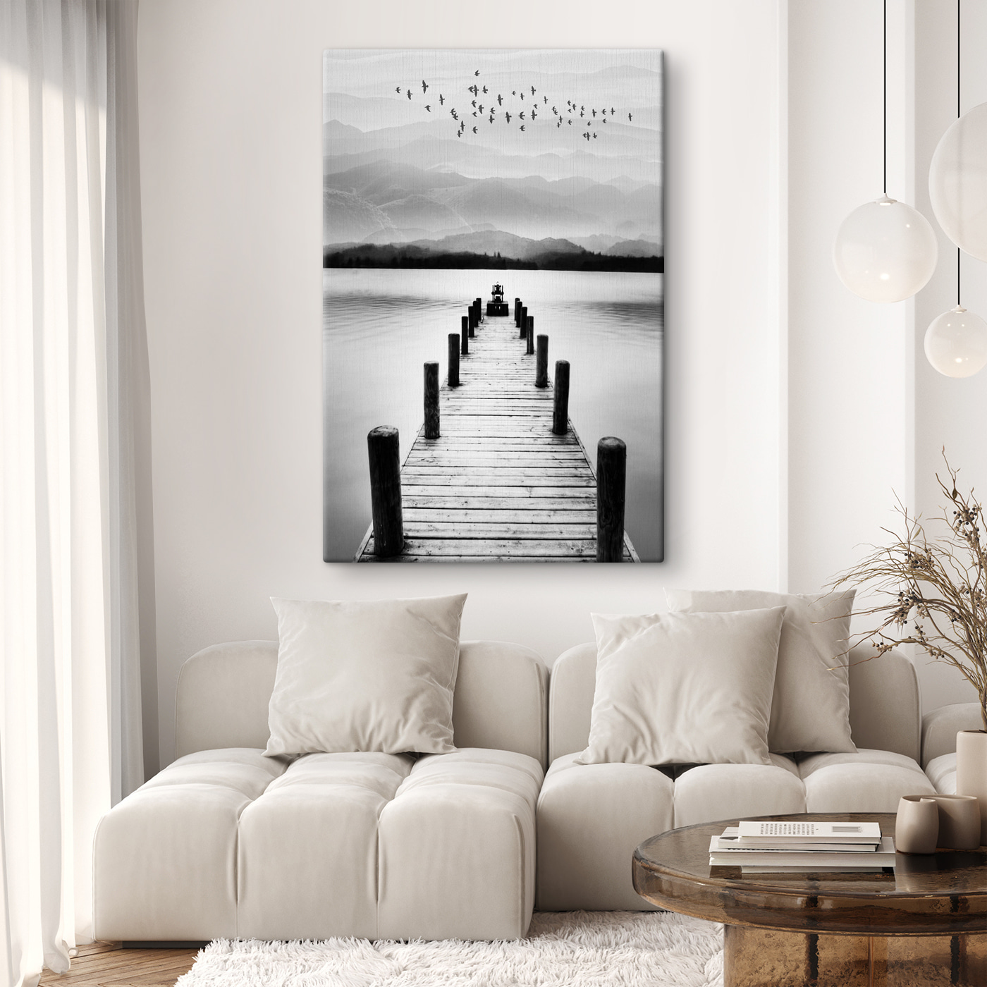 Stellen Sie sich einen ruhigen Morgen am See vor, ein sanfter Nebel steigt auf, während ein Vogelschwarm in den endlosen Himmel fliegt. Das ist es, was dieser schwarz-weiße Leinwanddruck so schön einfängt. Die ruhige Szene eignet sich perfekt für jeden Raum und gibt jedem das Gefühl, ein wenig entspannter und mit der Natur verbunden zu sein. Es ist eine eindrucksvolle Mischung aus stimmungsvollen Bergen und einem ruhigen See – einfach, aber tief bewegend. Vielleicht bleiben Ihre Gäste einfach stehen und seufzen, verzaubert von der Ruhe, die dieses Stück ausstrahlt. Ob neben Ihrem Sofa oder in Ihrem Arbeitszimmer, es regt sicher zu Tagträumen und Gesprächen an. Eine zeitlose Wahl für Kunstliebhaber und Wanderer gleichermaßen.