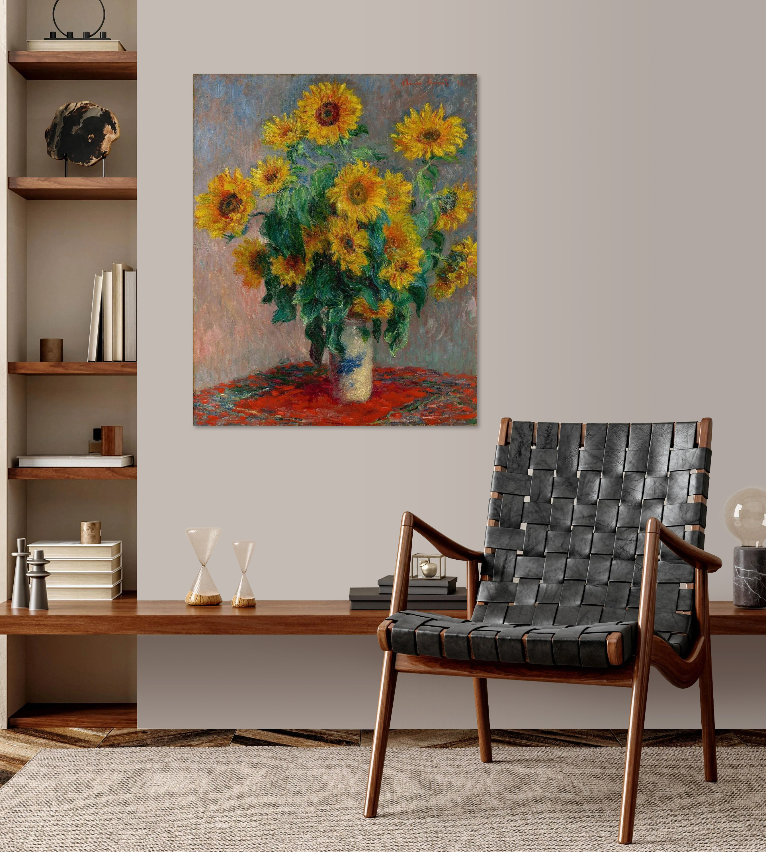 Dieser atemberaubende Leinwanddruck mit einem Strauß Sonnenblumen in einer Vase bringt frischen Wind in jeden Raum. Diese fröhlichen Blüten in leuchtendem Gelb und sattem Grün bringen einen Hauch von Natur ins Haus. Stellen Sie sich dieses Stück in einer gemütlichen Ecke vor, die zu warmen Gesprächen einlädt oder einfach einen Moment der Ruhe inmitten eines geschäftigen Tages bietet. Es ist, als hätte man das ganze Jahr über einen Hauch von Sommersonne. Dieses Kunstwerk eignet sich perfekt für alle, die Blumen lieben oder einen Farbtupfer setzen wollen, und wird mit Sicherheit Freude und vielleicht sogar das eine oder andere Lächeln hervorrufen. Wer würde sich nicht wohlfühlen, wenn solch reizende Gefährten seine Wände zieren?