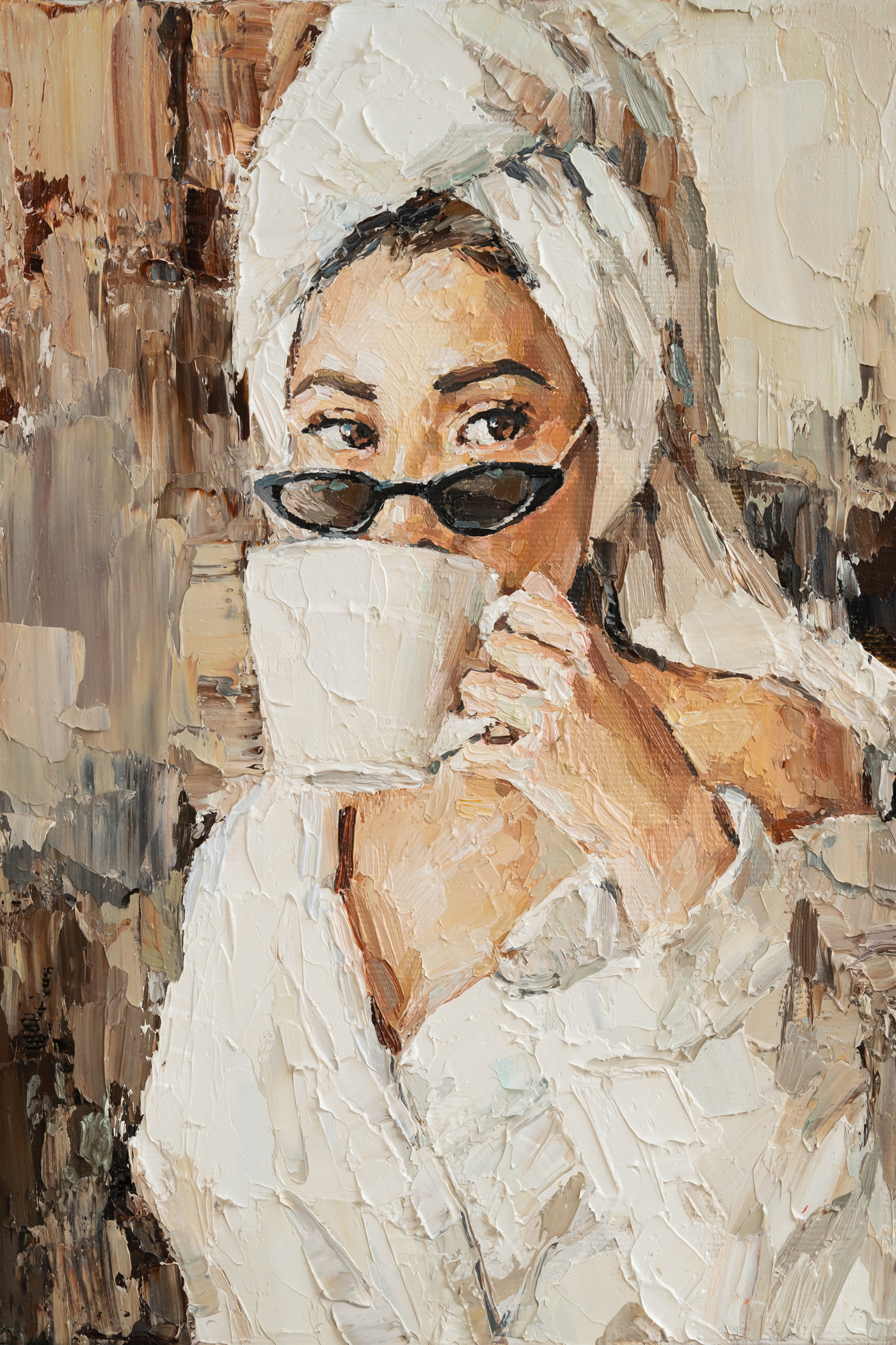 Stellen Sie sich vor: eine gemütliche Ecke in Ihrem Zuhause, vielleicht die Küche oder der Platz am Fenster. Jetzt stellen Sie sich vor, dass Sie diesen Leinwanddruck aufhängen, auf dem eine Frau zu sehen ist, die ihre Tasse Freude genießt. Mit einem Handtuch auf dem Kopf und einer Sonnenbrille, die schreit: “So bin ich aufgewacht”, hat sie eine mühelos schicke Ausstrahlung. Die warmen Farben spielen schön zusammen, rufen ein Gefühl der Ruhe hervor und laden zum Verschnaufen ein. Perfekt für eine Kaffee-Ecke oder einen Raum, der einen Hauch von Eleganz und Spaß braucht, spricht dieses Stück zu jenen ruhigen Momenten, die wir alle schätzen. Ob Kaffee oder Tee, dieses Kunstwerk regt zum Innehalten an und ist damit ein schöner Begleiter im Alltag.