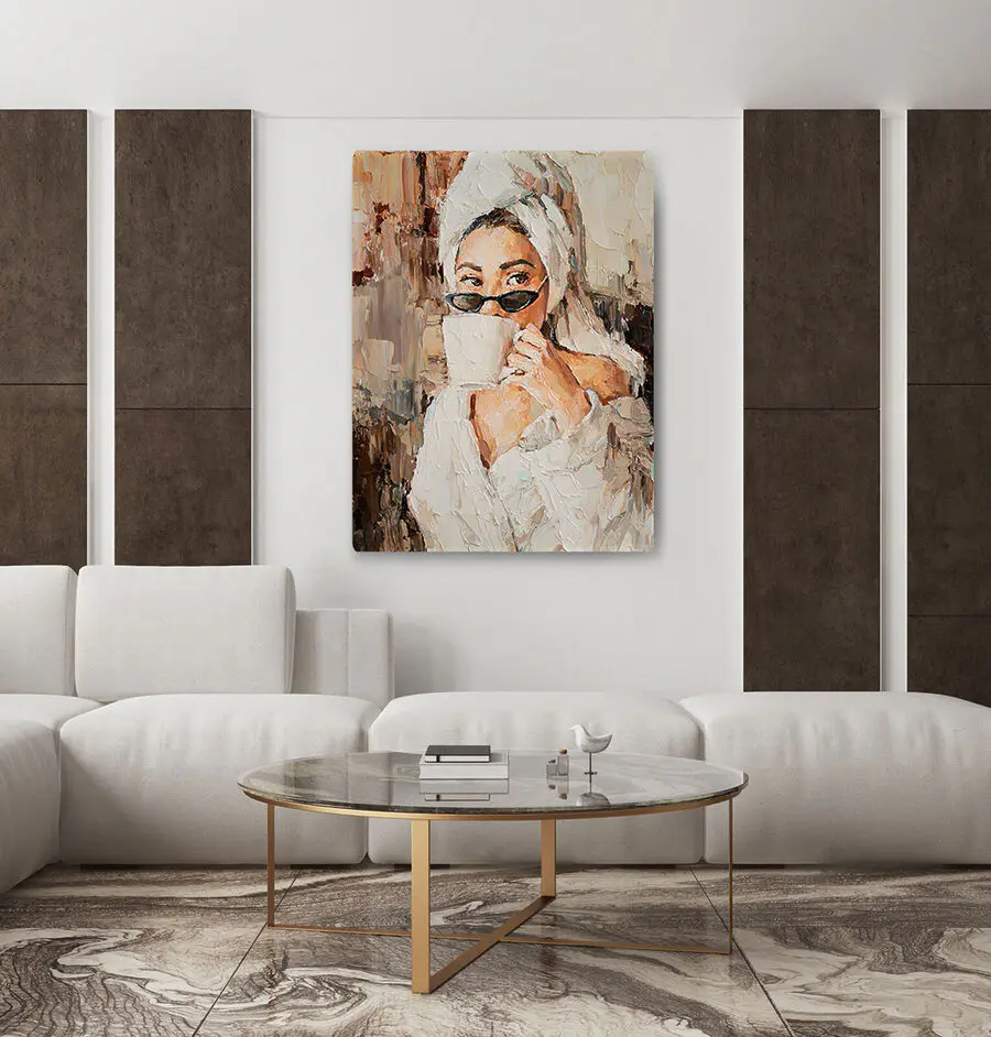 Stellen Sie sich vor: eine gemütliche Ecke in Ihrem Zuhause, vielleicht die Küche oder der Platz am Fenster. Jetzt stellen Sie sich vor, dass Sie diesen Leinwanddruck aufhängen, auf dem eine Frau zu sehen ist, die ihre Tasse Freude genießt. Mit einem Handtuch auf dem Kopf und einer Sonnenbrille, die schreit: “So bin ich aufgewacht”, hat sie eine mühelos schicke Ausstrahlung. Die warmen Farben spielen schön zusammen, rufen ein Gefühl der Ruhe hervor und laden zum Verschnaufen ein. Perfekt für eine Kaffee-Ecke oder einen Raum, der einen Hauch von Eleganz und Spaß braucht, spricht dieses Stück zu jenen ruhigen Momenten, die wir alle schätzen. Ob Kaffee oder Tee, dieses Kunstwerk regt zum Innehalten an und ist damit ein schöner Begleiter im Alltag.