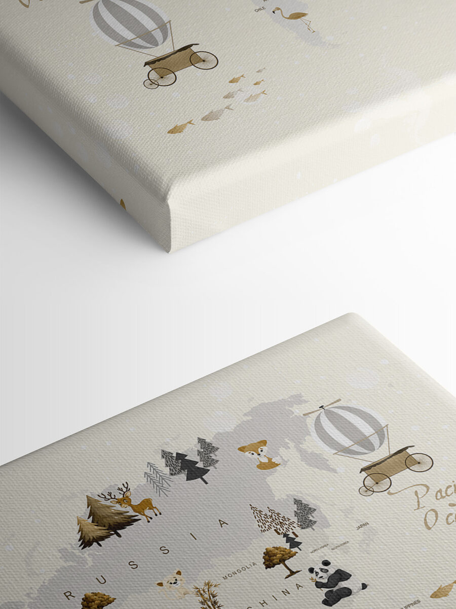 Hallo zusammen! Sieh dir diesen bezaubernden Leinwanddruck mit dem Titel “Weltkarte mit Tieren” an – perfekt, um jedem Kinderzimmer eine verspielte Note zu verleihen. Es ist wie eine lustige, kunstvolle Geografiestunde, die vor Charakter nur so strotzt. Stellen Sie sich vor, wie Ihr Kind mit den Fingern über die Kontinente fährt und entdeckt, wo sich Pinguine aufhalten oder wo Löwen brüllen.