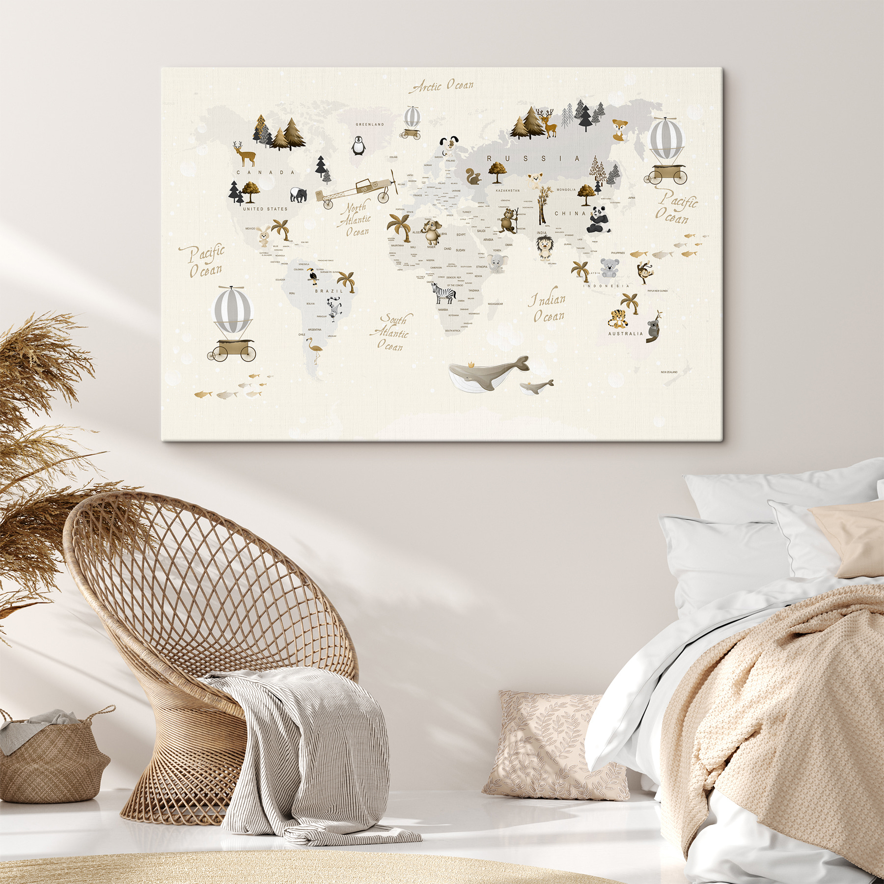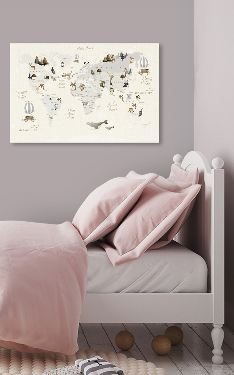 Hallo zusammen! Sieh dir diesen bezaubernden Leinwanddruck mit dem Titel “Weltkarte mit Tieren” an – perfekt, um jedem Kinderzimmer eine verspielte Note zu verleihen. Es ist wie eine lustige, kunstvolle Geografiestunde, die vor Charakter nur so strotzt. Stellen Sie sich vor, wie Ihr Kind mit den Fingern über die Kontinente fährt und entdeckt, wo sich Pinguine aufhalten oder wo Löwen brüllen.