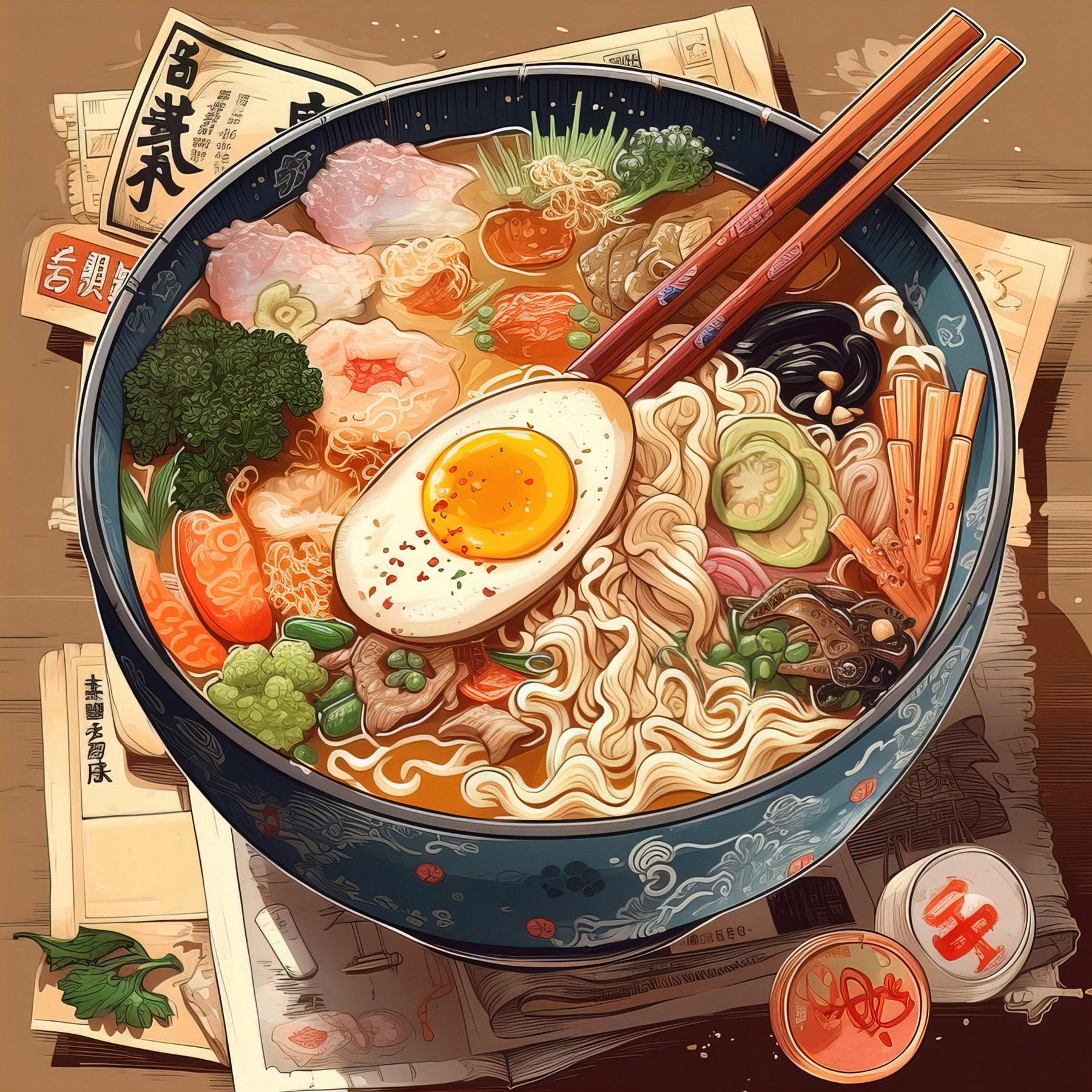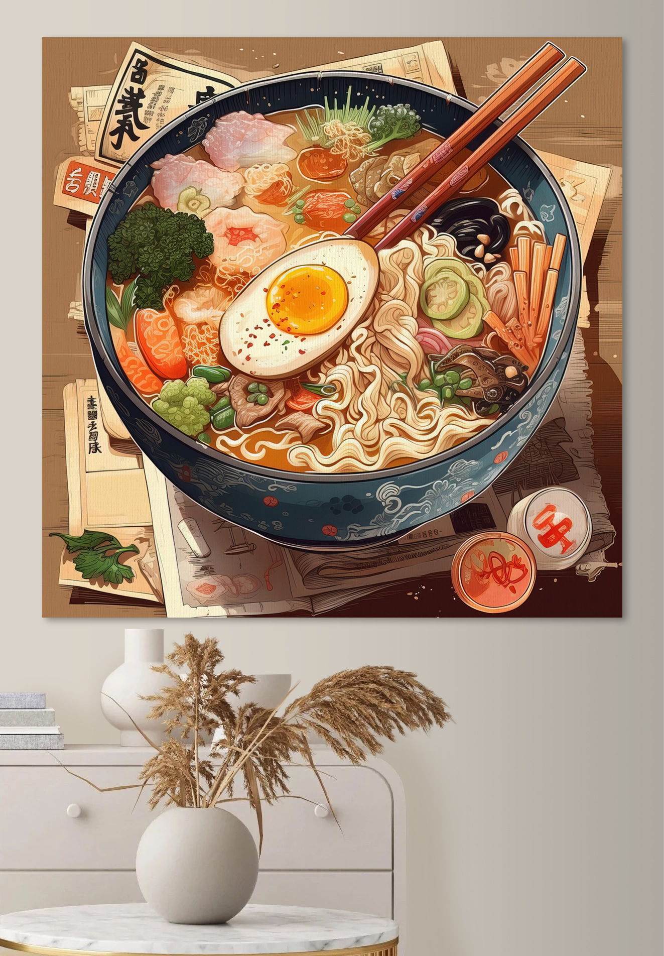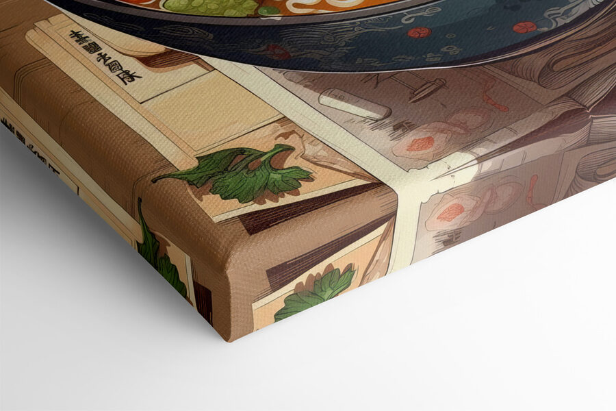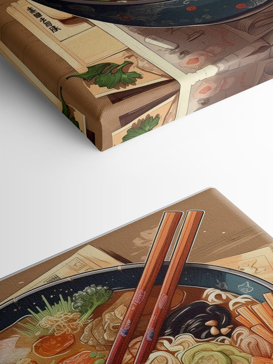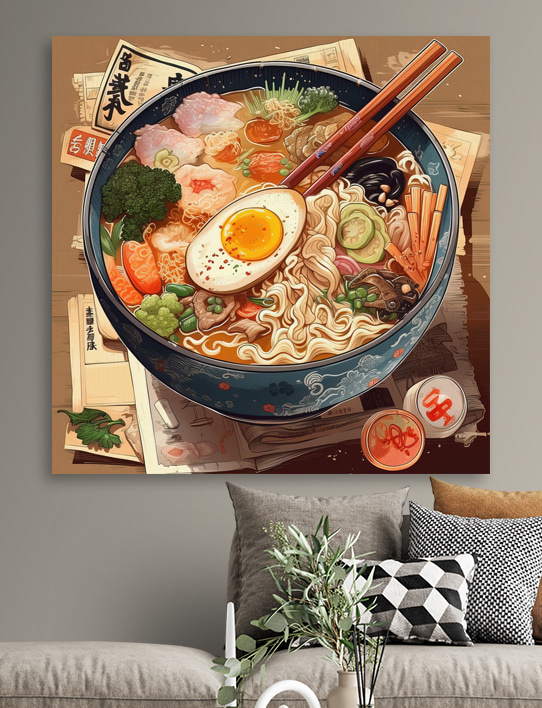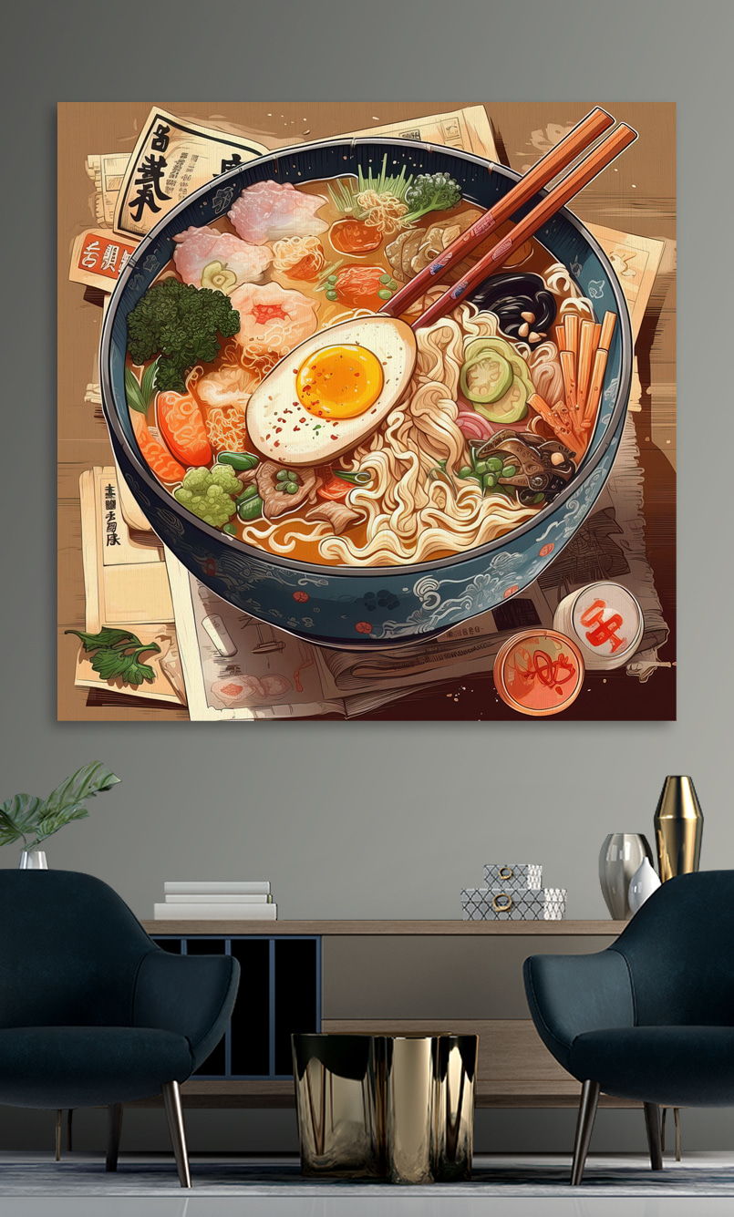 Ganz gleich, ob Sie sich für Essen, japanische Ästhetik oder einfach nur für einzigartige, auffällige Kunst interessieren, diese Leinwand ist eine fantastische Wahl. Es ist, als hätte man eine köstliche, gemütliche Mahlzeit direkt an der Wand – nur ohne die Kalorien!