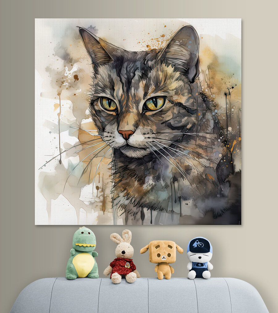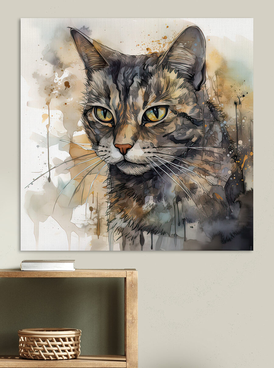 Haben Sie jemals gedacht, dass Ihr Wohnzimmer ein bisschen mehr Persönlichkeit braucht? Dann sollten Sie sich dieses umwerfende Leinwandbild ansehen – ein Gesprächsanreger, der nicht alle Ihre Snacks auffrisst. “Wandbilder s32299” fängt den wilden und doch etwas distanzierten Blick dieser Katze in lebhaften Aquarelltupfern ein. Das Bild ist für Tier- und Kunstliebhaber gleichermaßen geeignet und versprüht Charme und einen Hauch von Geheimnis – diese Augen, nicht wahr?
