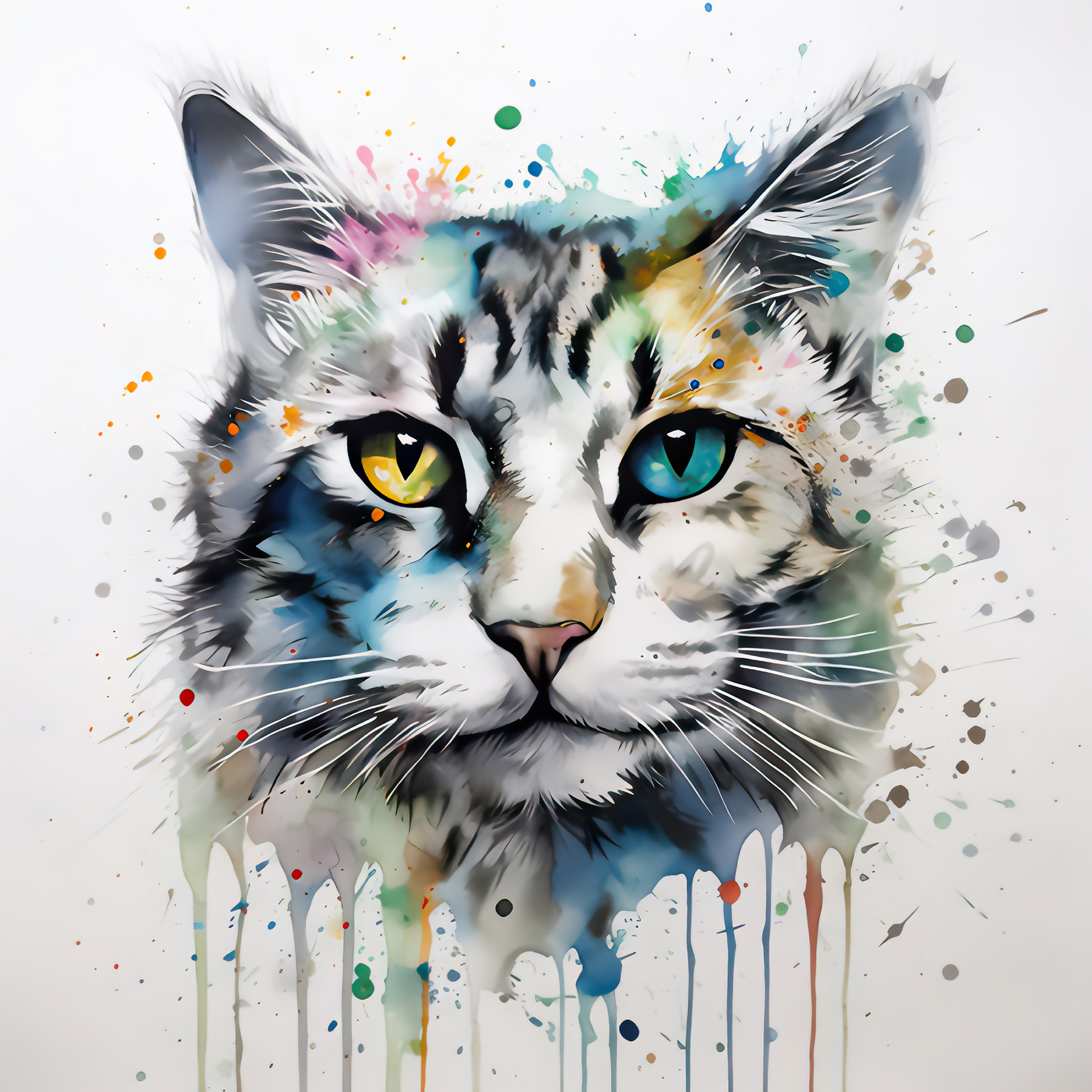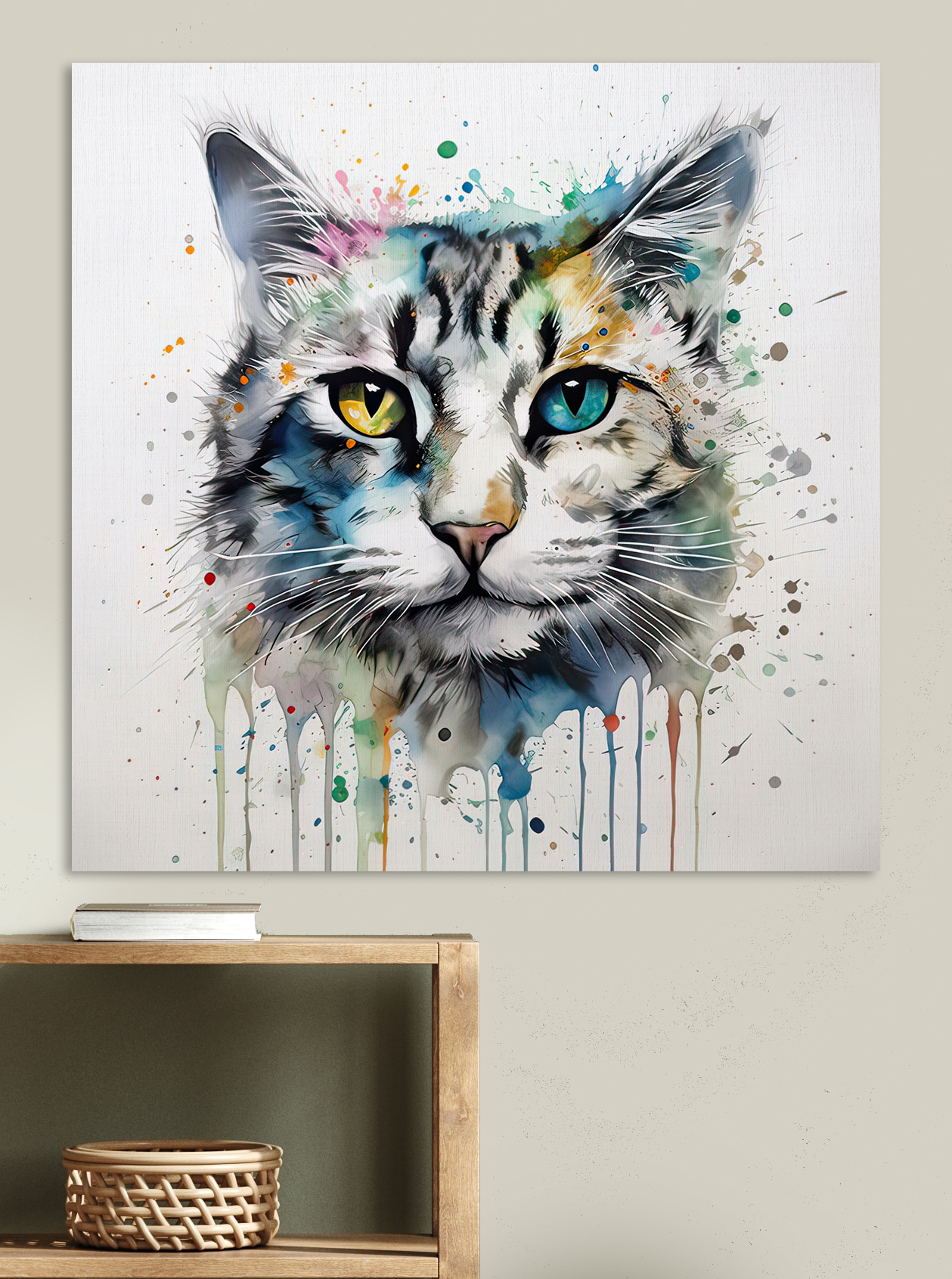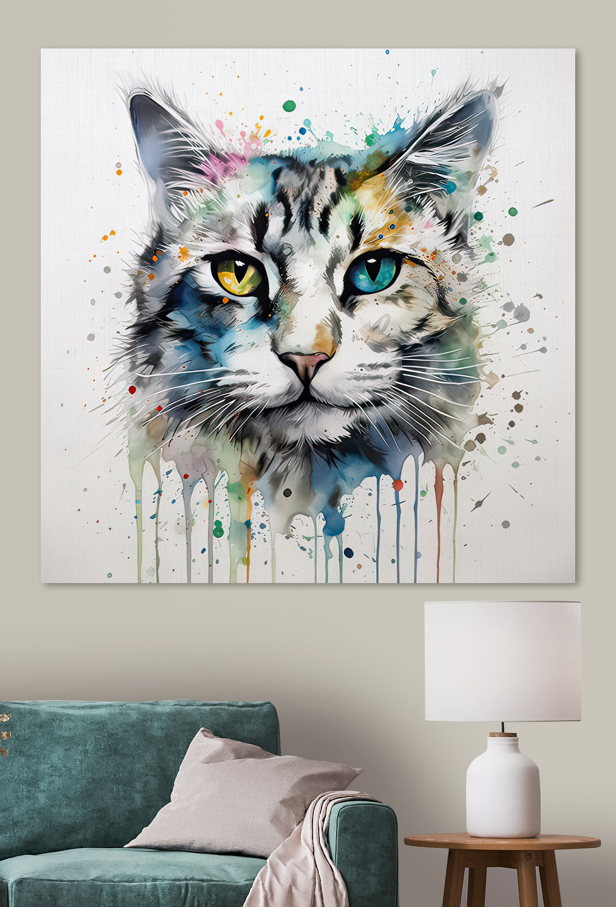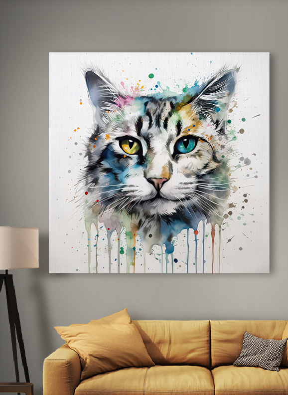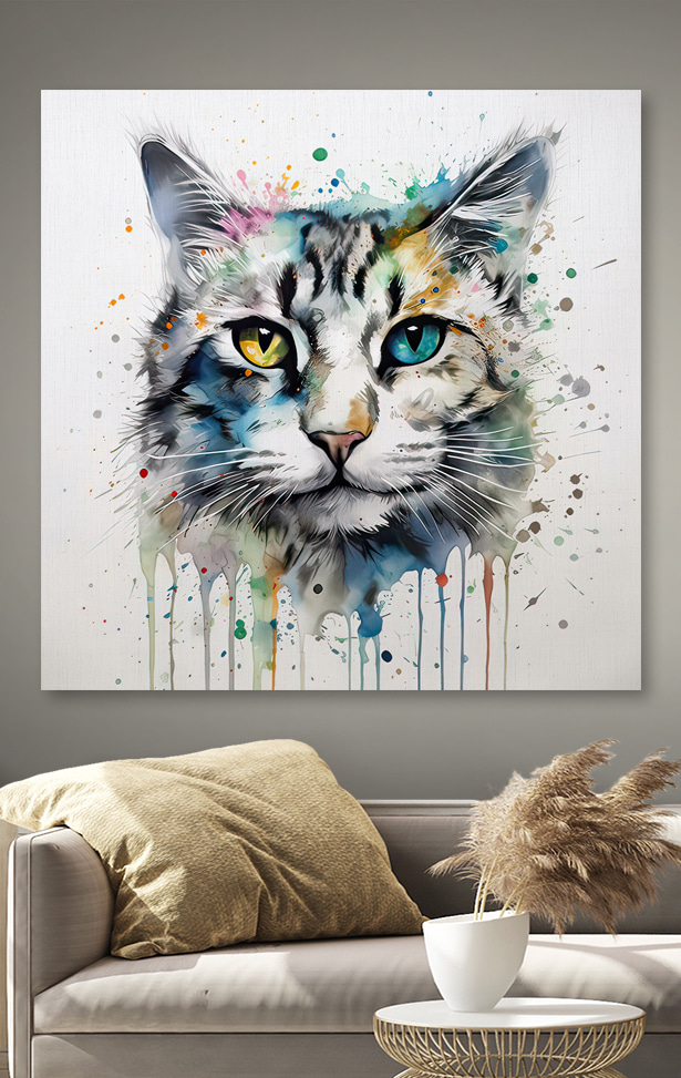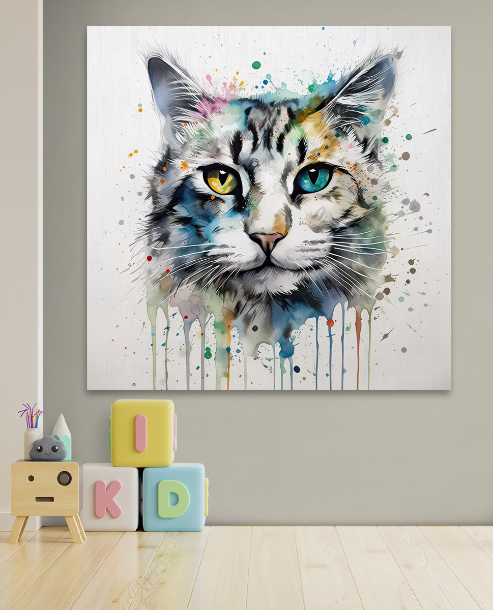 Lernen Sie das Leinwandbild “Vibrant Cat with Colorful Eyes” kennen, eine schnurrige Mischung aus Laune und Charme. Dieses auffällige Kunstwerk versprüht eine entzückende Farbenpracht, die jedem Raum einen verspielten Geist verleiht. Stellen Sie sich vor, Sie betreten einen Raum, über den diese auffällige Katze wacht – ihre ungleichen Augen scheinen eine Welt voller Geheimnisse zu bergen. Ob im Kinderzimmer oder in einer gemütlichen Leseecke, dieses Stück sorgt für eine witzige Abwechslung, die mit Sicherheit für Gesprächsstoff sorgt. Und wer liebt nicht eine Katze, die genau die richtige Portion Unfug ausstrahlt? Im Grunde ist es eine Einladung, der Fantasie freien Lauf zu lassen.