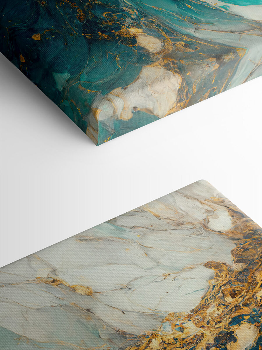 Das Leinwandbild “Türkisfarbene Wirbel mit bernsteinfarbenen Adern” ist wie ein Stück der Seele des Ozeans an Ihrer Wand. Stellen Sie sich ein stürmisches Meer vor, das in der Zeit eingefroren ist, mit leuchtend türkisfarbenen Wellen und bernsteinfarbenen Adern – ein Hauch des Chaos der Natur, wunderschön eingefangen. Perfekt für ein Loft oder um jedem Raum eine künstlerische Note zu verleihen. Dieses Stück hat diese beruhigende und doch faszinierende Energie; es fordert still und leise Aufmerksamkeit. Die Gäste werden sich vielleicht zweimal umdrehen und über seine Tiefen nachdenken. Es wird zu Gesprächen und Tagträumen anregen, vielleicht sogar zu dem einen oder anderen Gedicht!