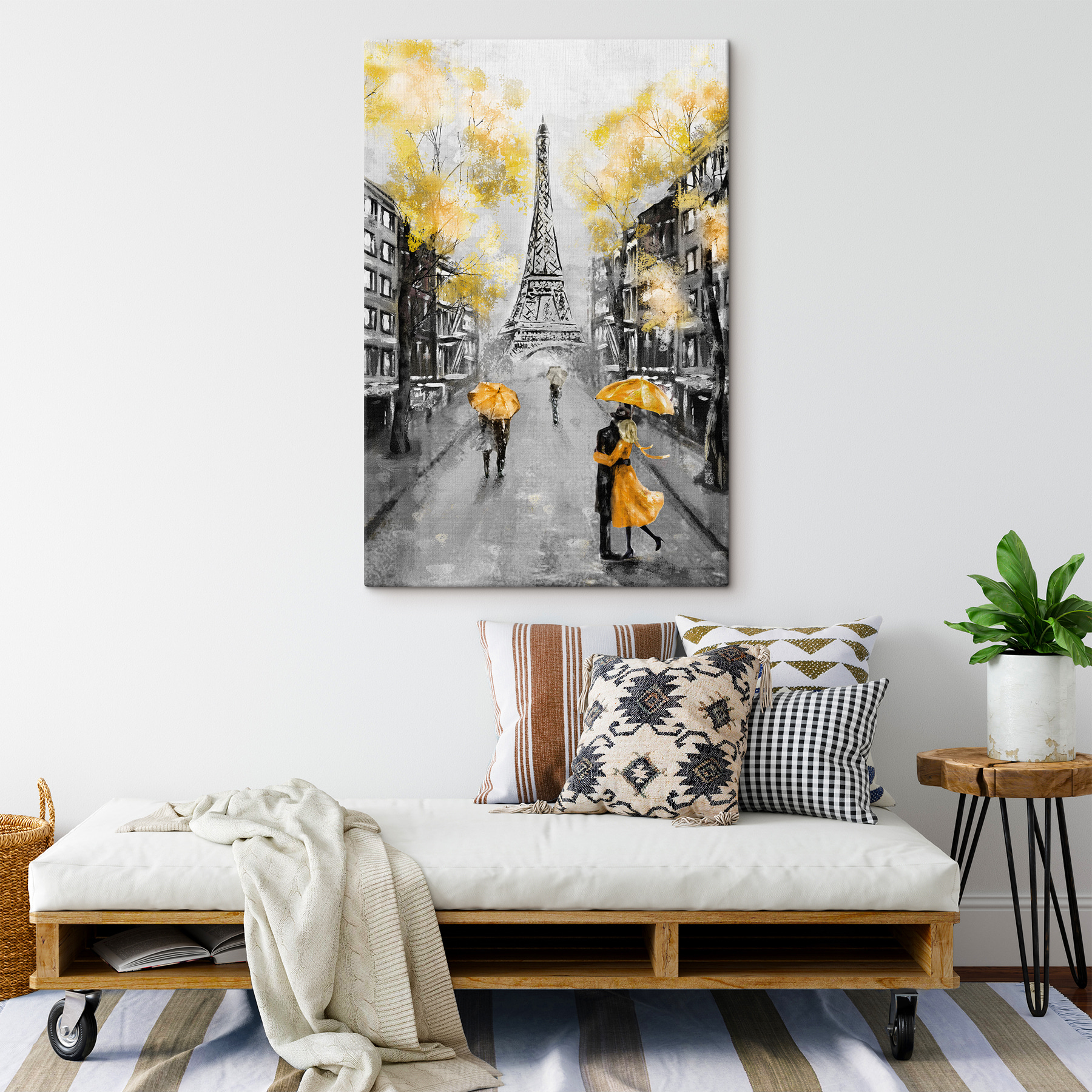 Tauchen Sie ein in den Charme von Paris mit diesem entzückenden Leinwanddruck, der belebte Straßen unter einem Baldachin aus fröhlichen gelben Regenschirmen zeigt. Es ist wie ein kleines Fenster zur Stadt der Liebe, wo jeder Regentropfen eine Geschichte erzählt. Stellen Sie sich vor, wie Sie es sich mit einem warmen Getränk in der Hand auf Ihrer Couch gemütlich machen, während diese Szene Tagträume von romantischen Spaziergängen und spontanen Abenteuern hervorruft. Der Eiffelturm ragt über die Gebäude hinaus und erinnert uns an all die Wunder, die darauf warten, erkundet zu werden. Dieses Kunstwerk verleiht jedem Raum einen Hauch von Freude und einen Farbtupfer und verwandelt ihn in eine gemütliche Ecke, die uns zuflüstert: “Lass uns einen Spaziergang machen!”